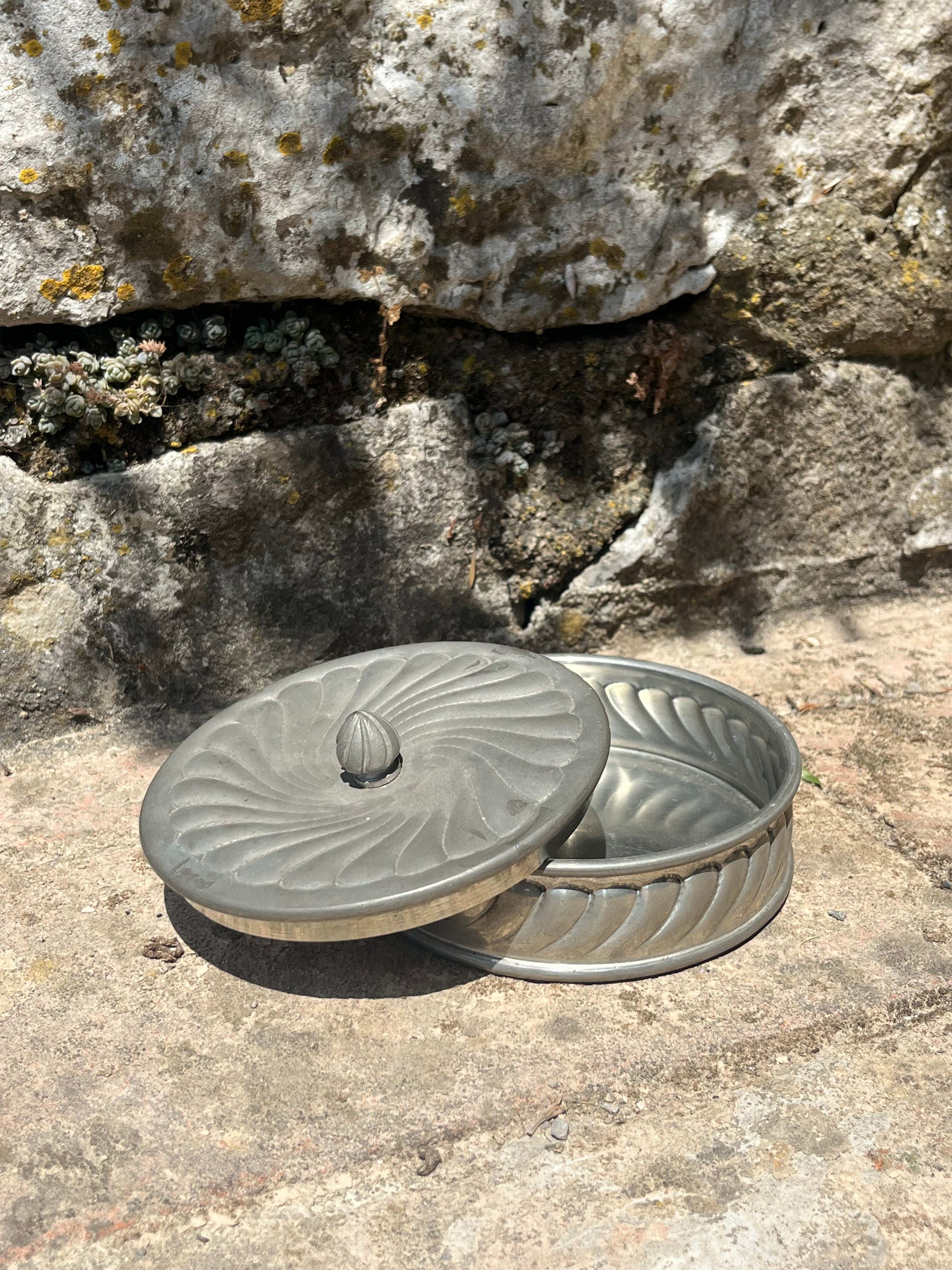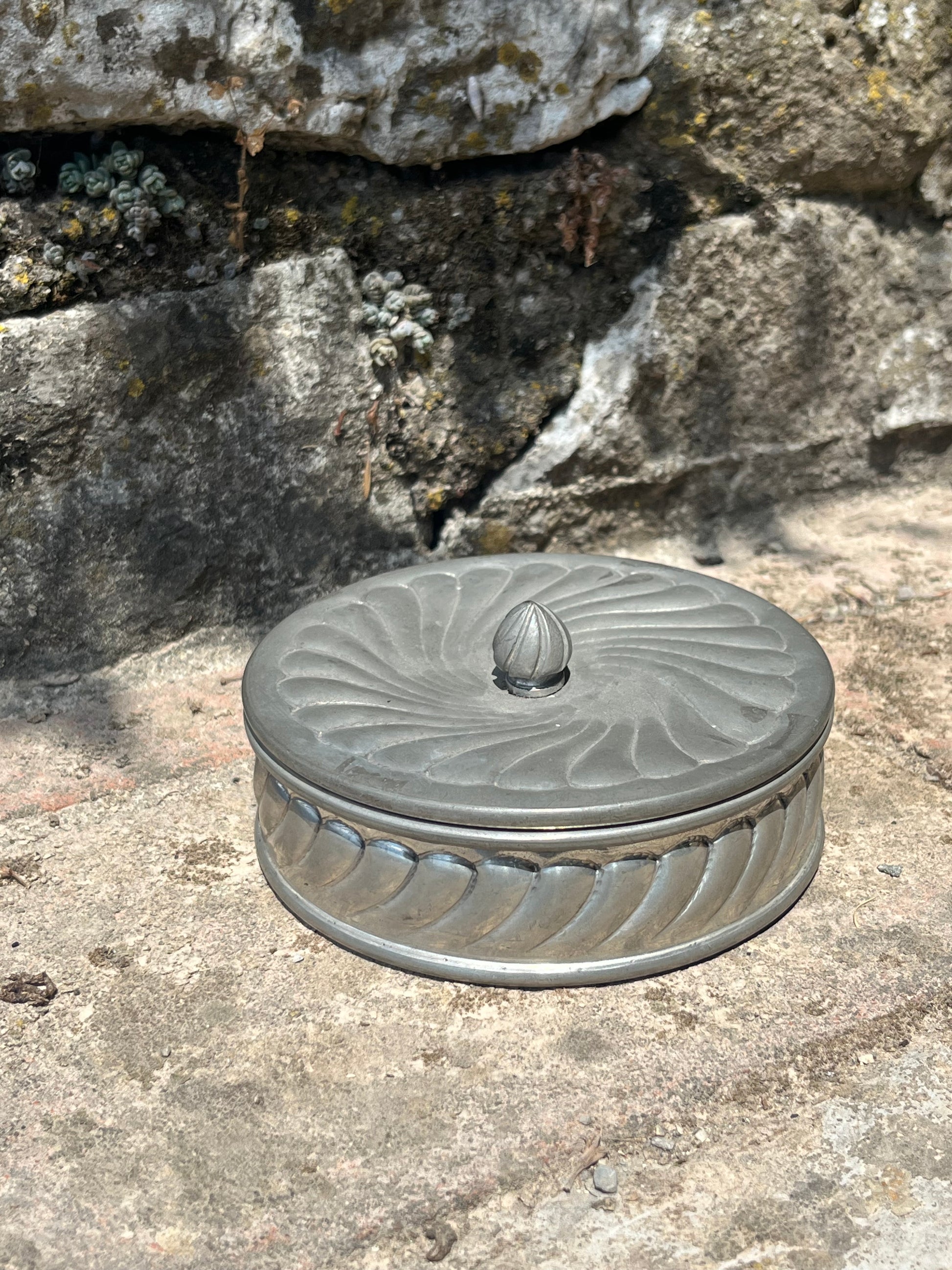Fin lille swirl æske / bonbonniere i sølvplet. Stemplet i bunden. Har lidt patina i form af små buler, men intet der påvirker funktionen.