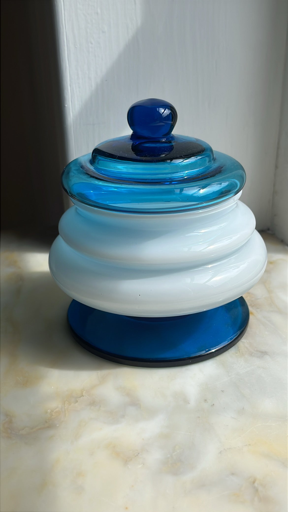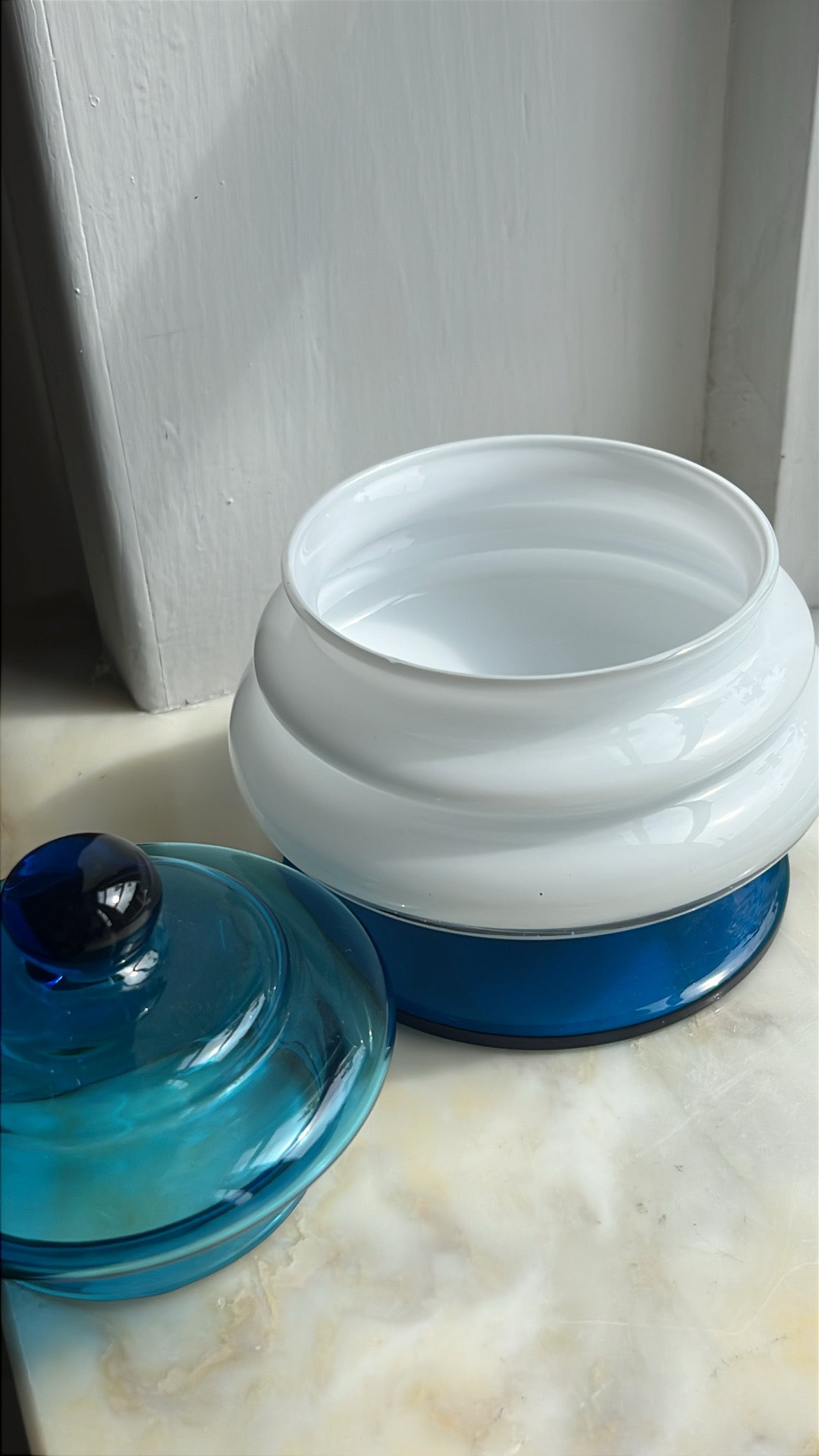 Mundblæst flerfarvet bonbonniere i blå nuancer.