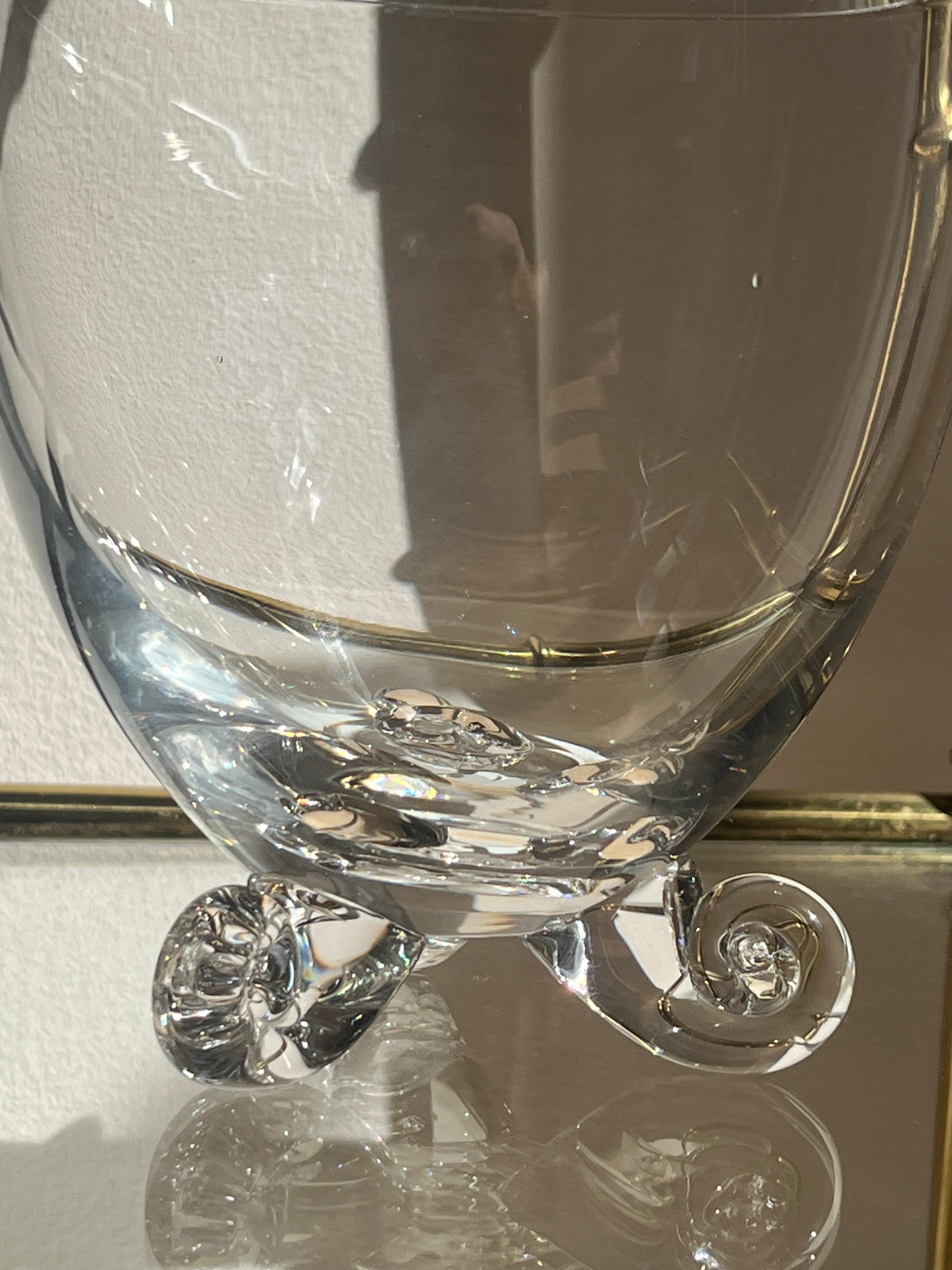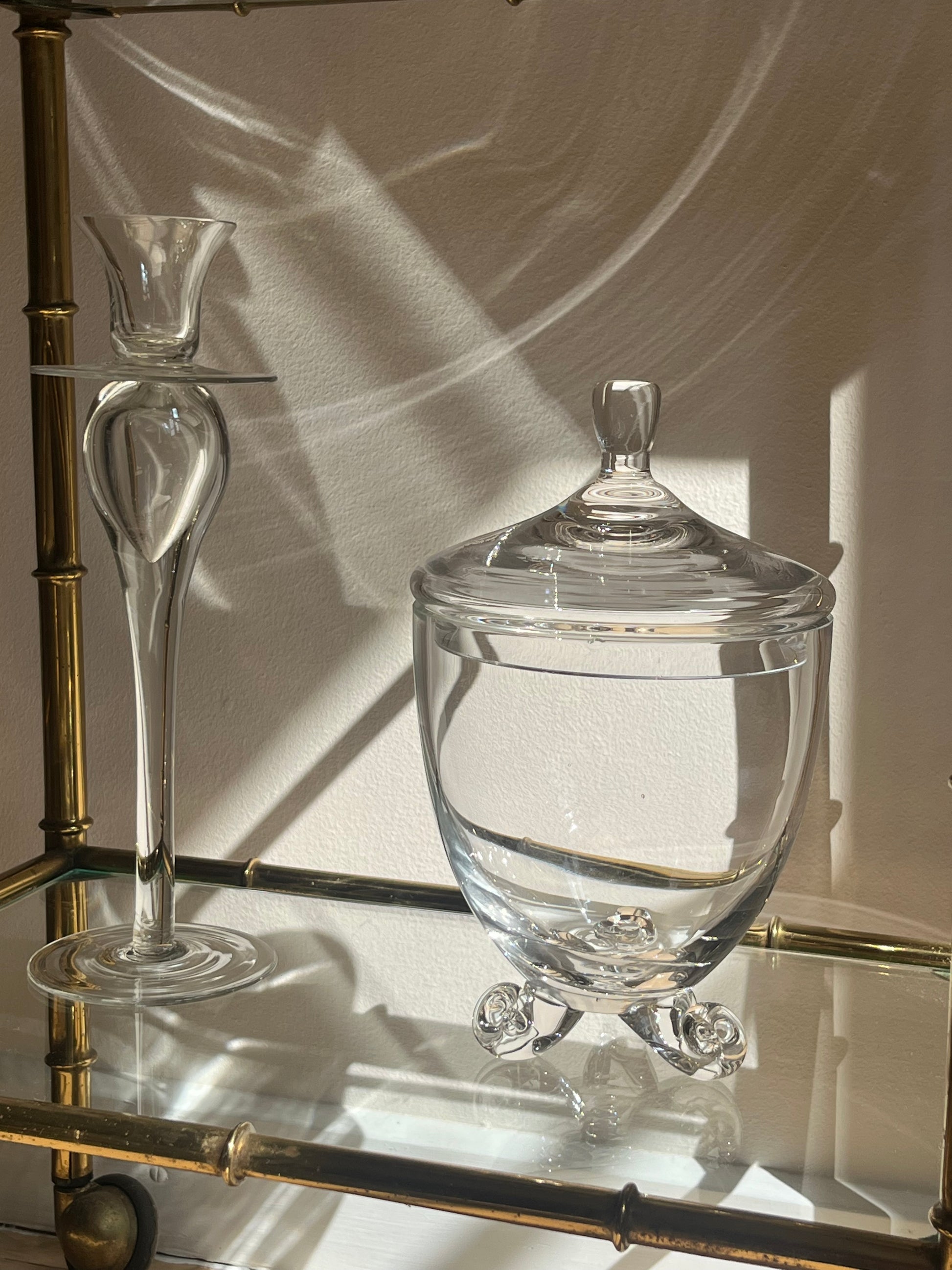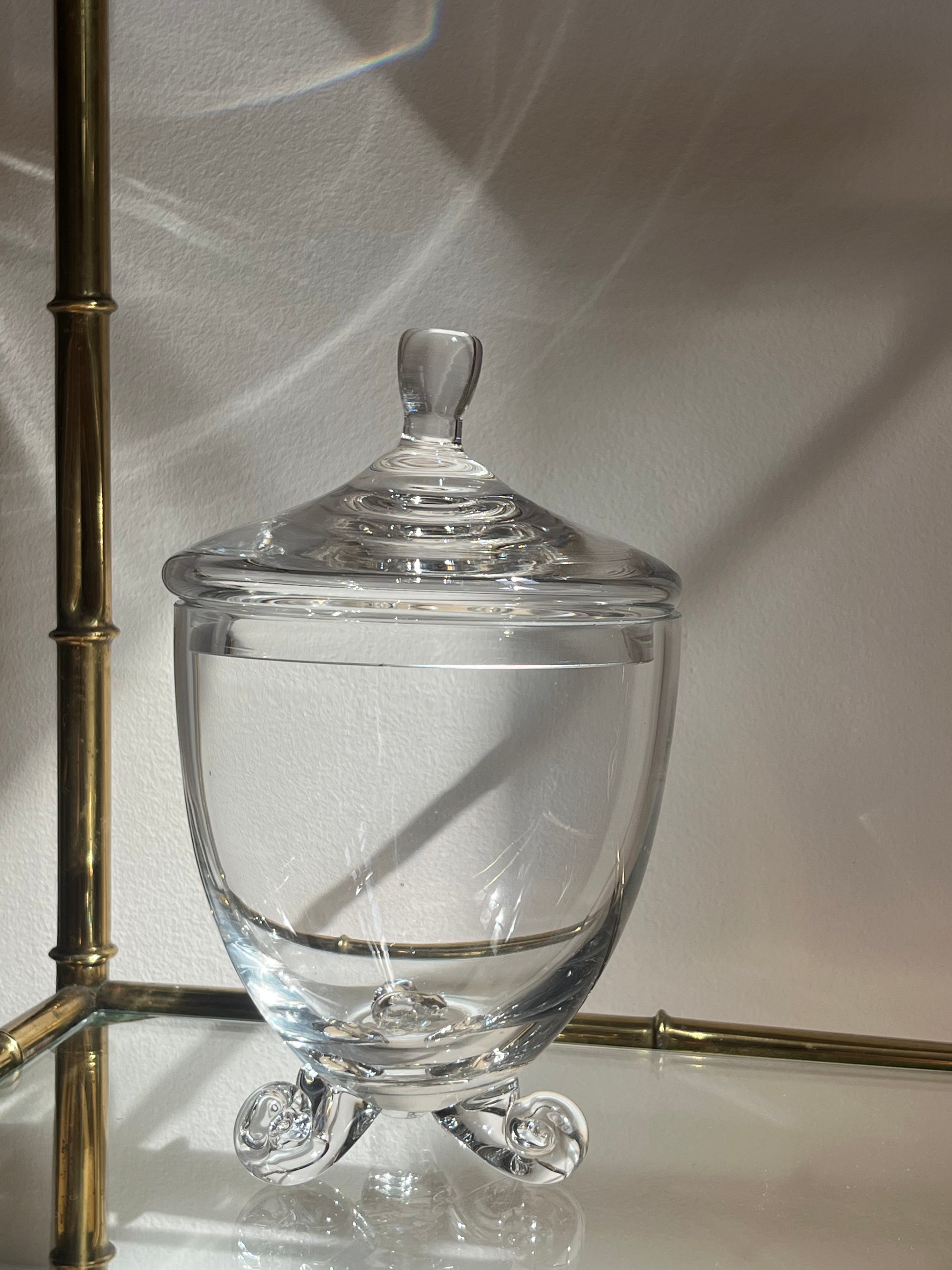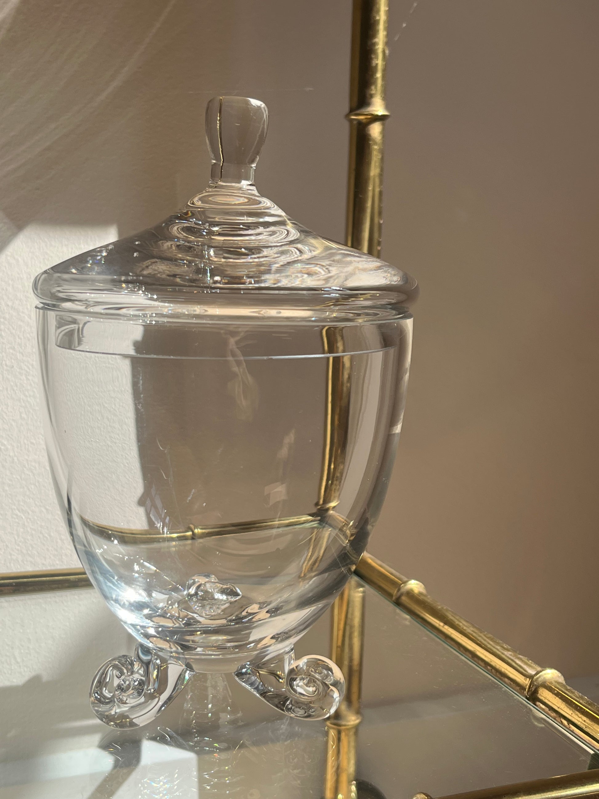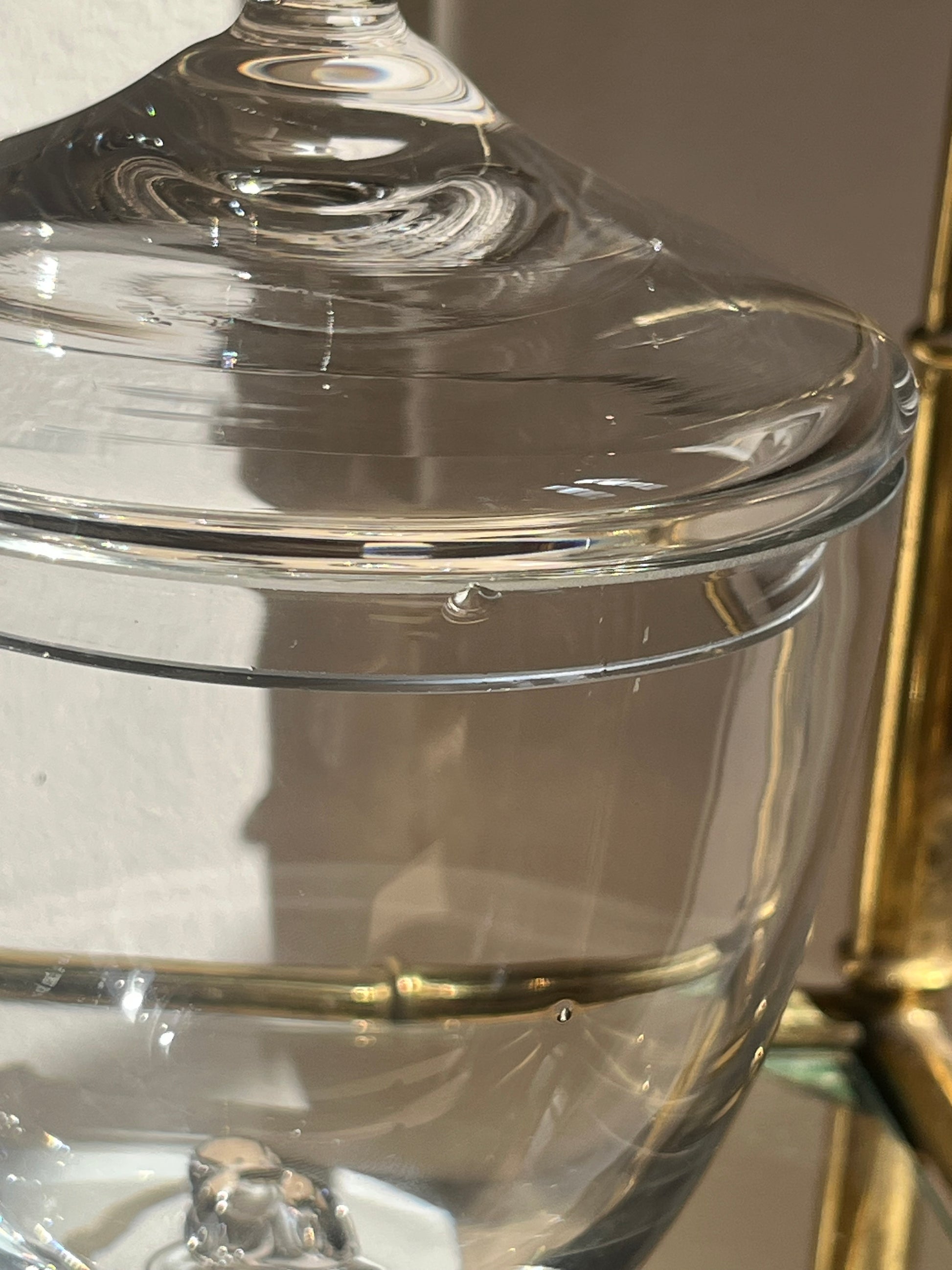 Smuk mundblæst glas bonbonniere på fødder. Har enkelte bobler i glasset som uperfektheder.