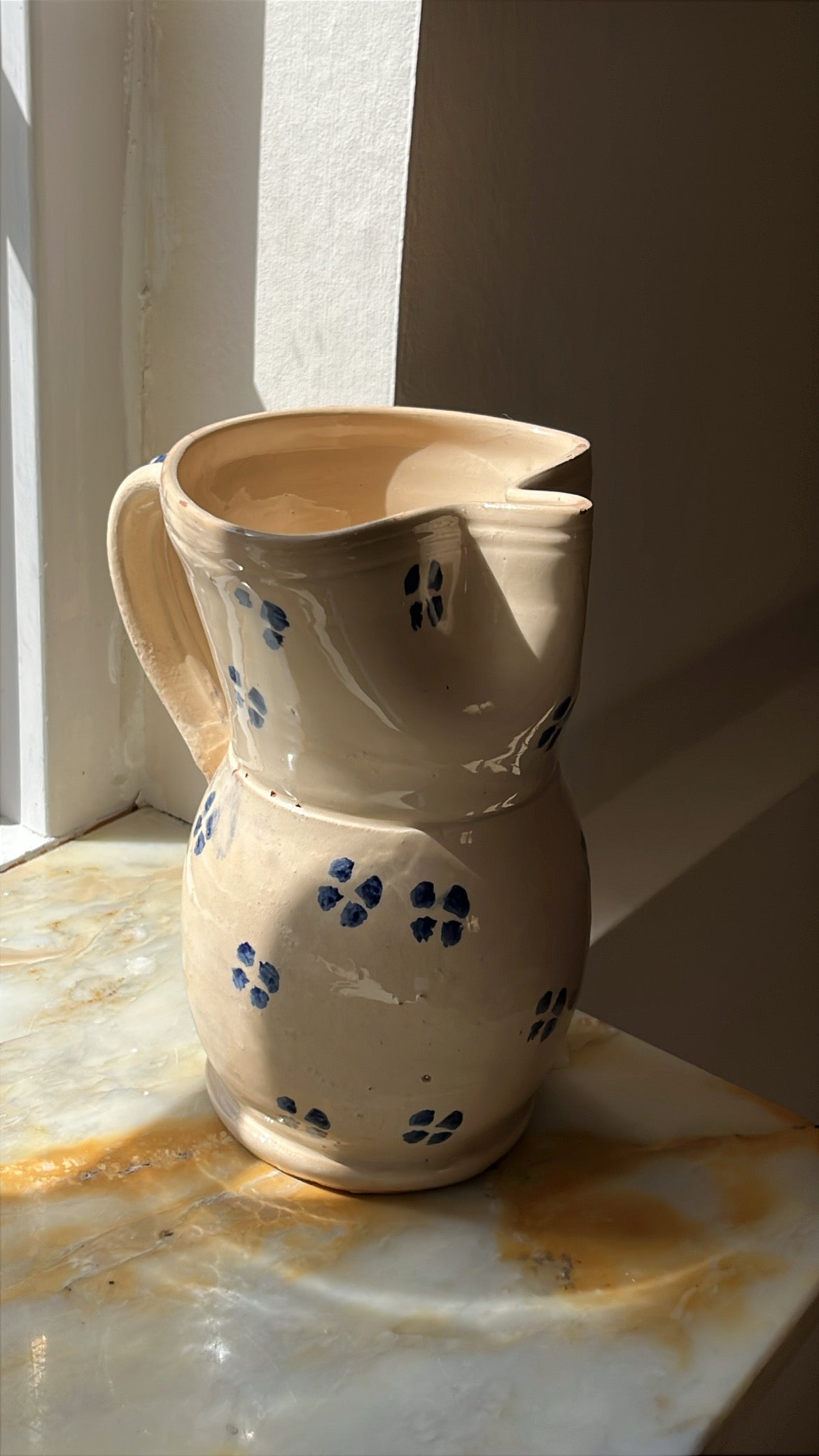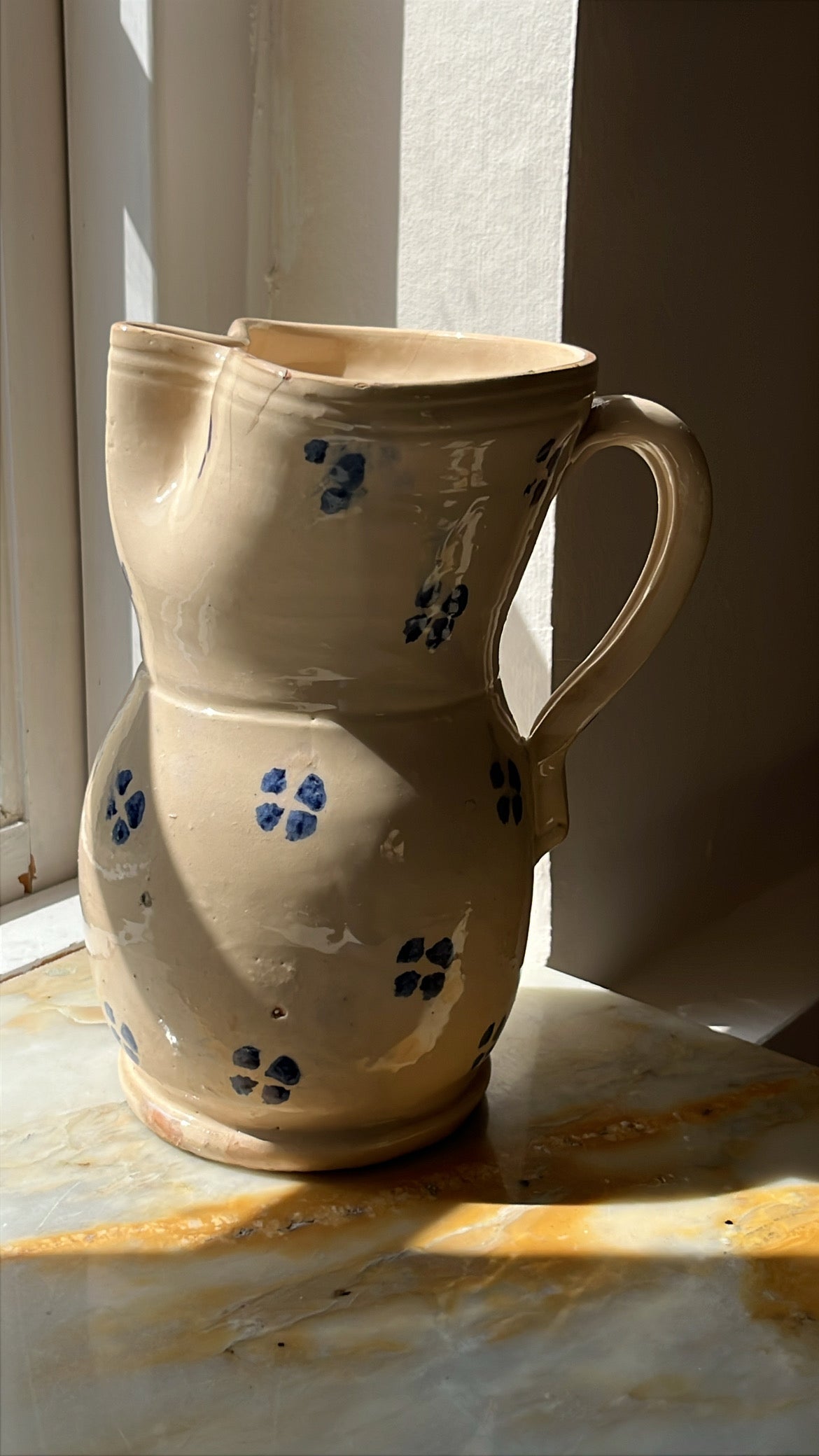 Klassisk italiensk terracotta kande med dekorativt blåt mønster. Lettere patineret. God til dekoration eller blomster.