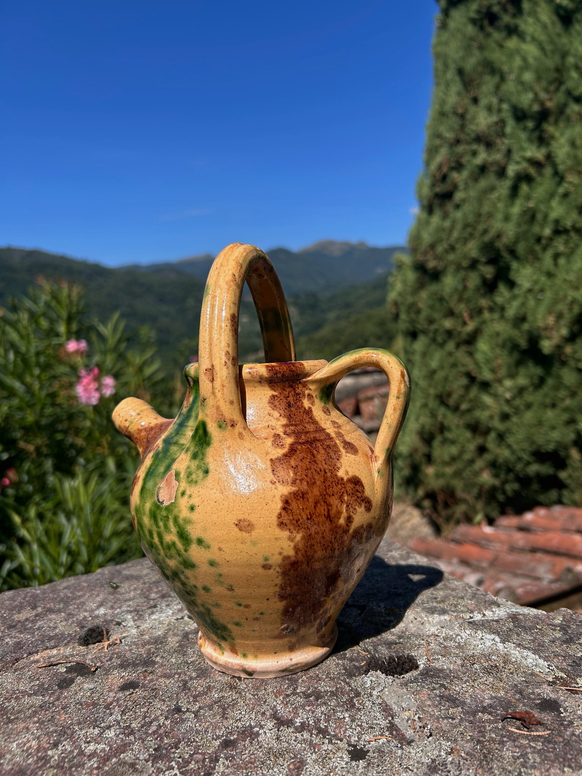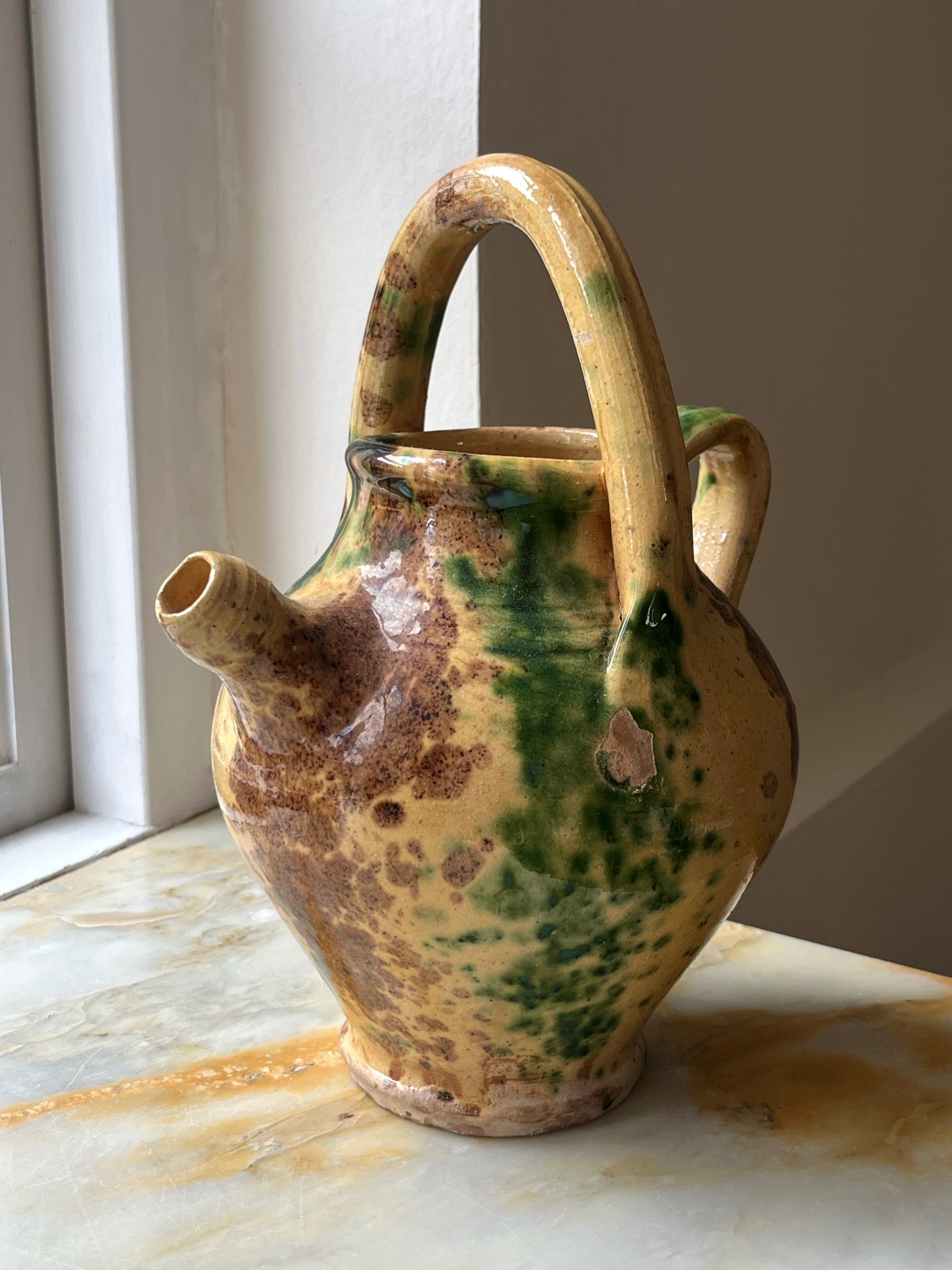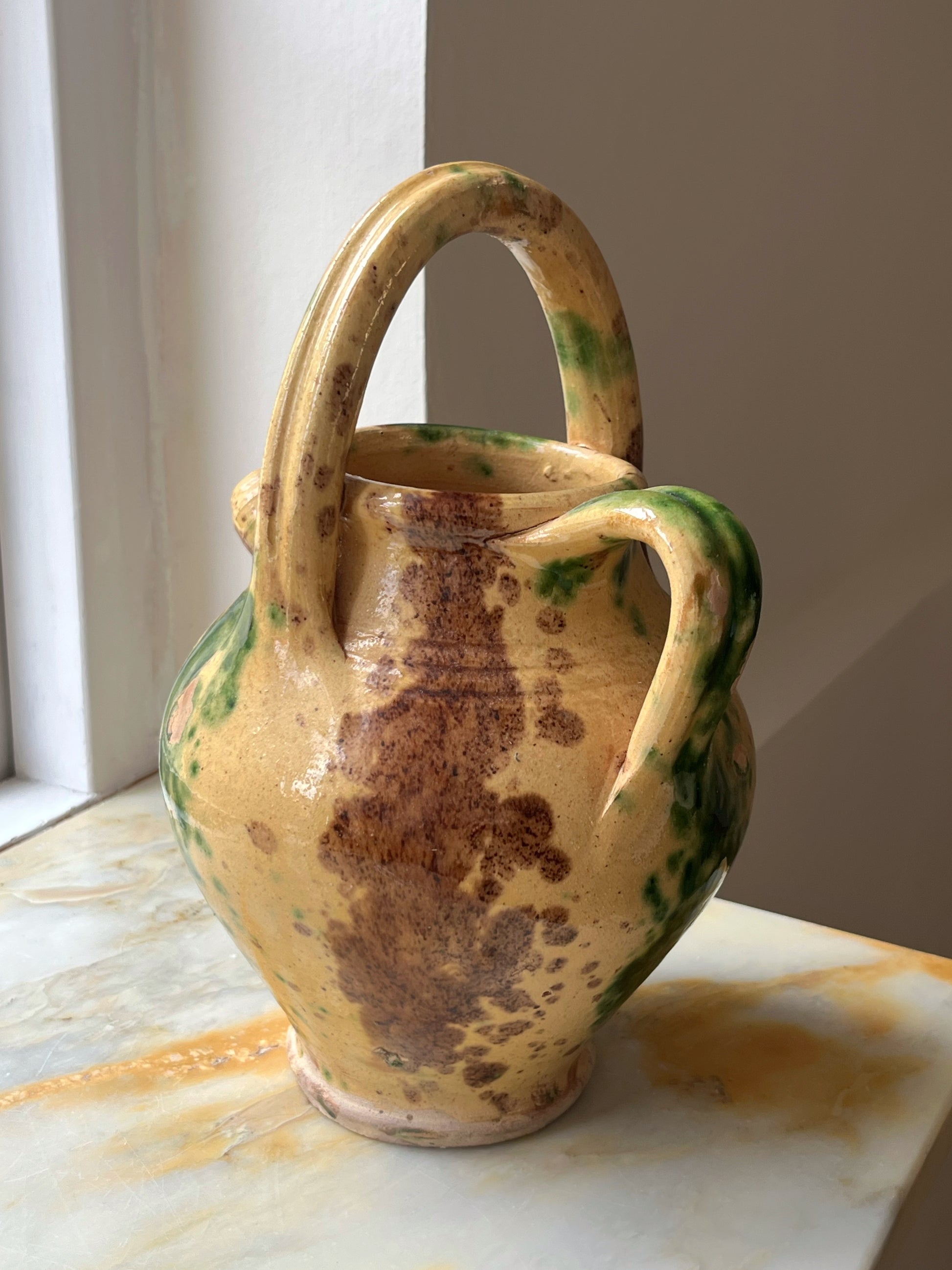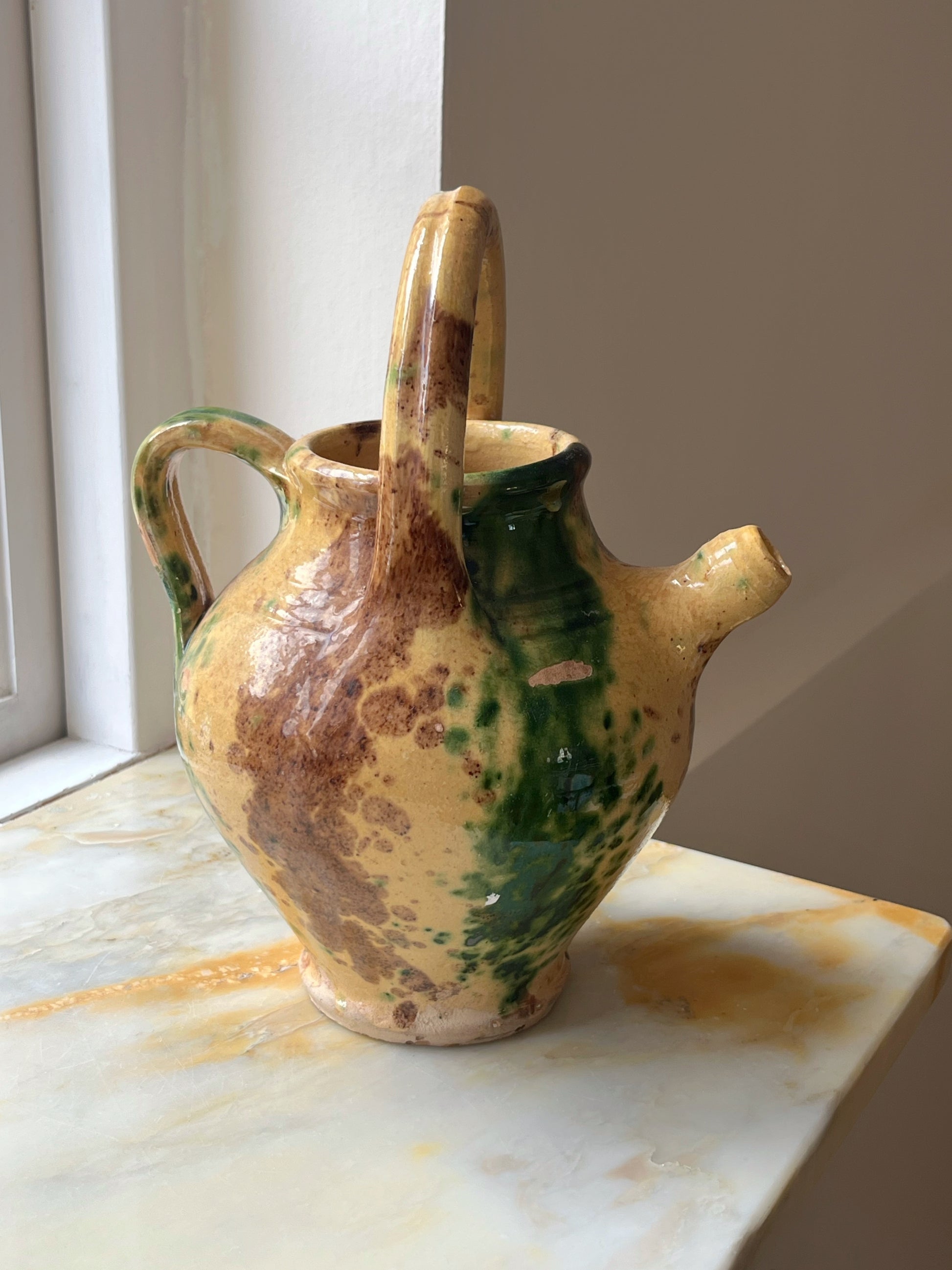 Keramikkrukke med hank i grønt og brunligt mønster. Let patineret.