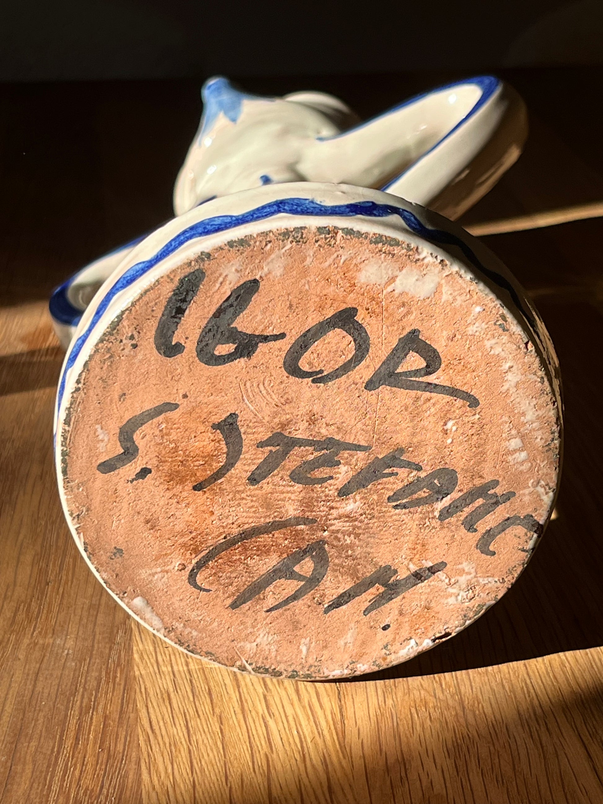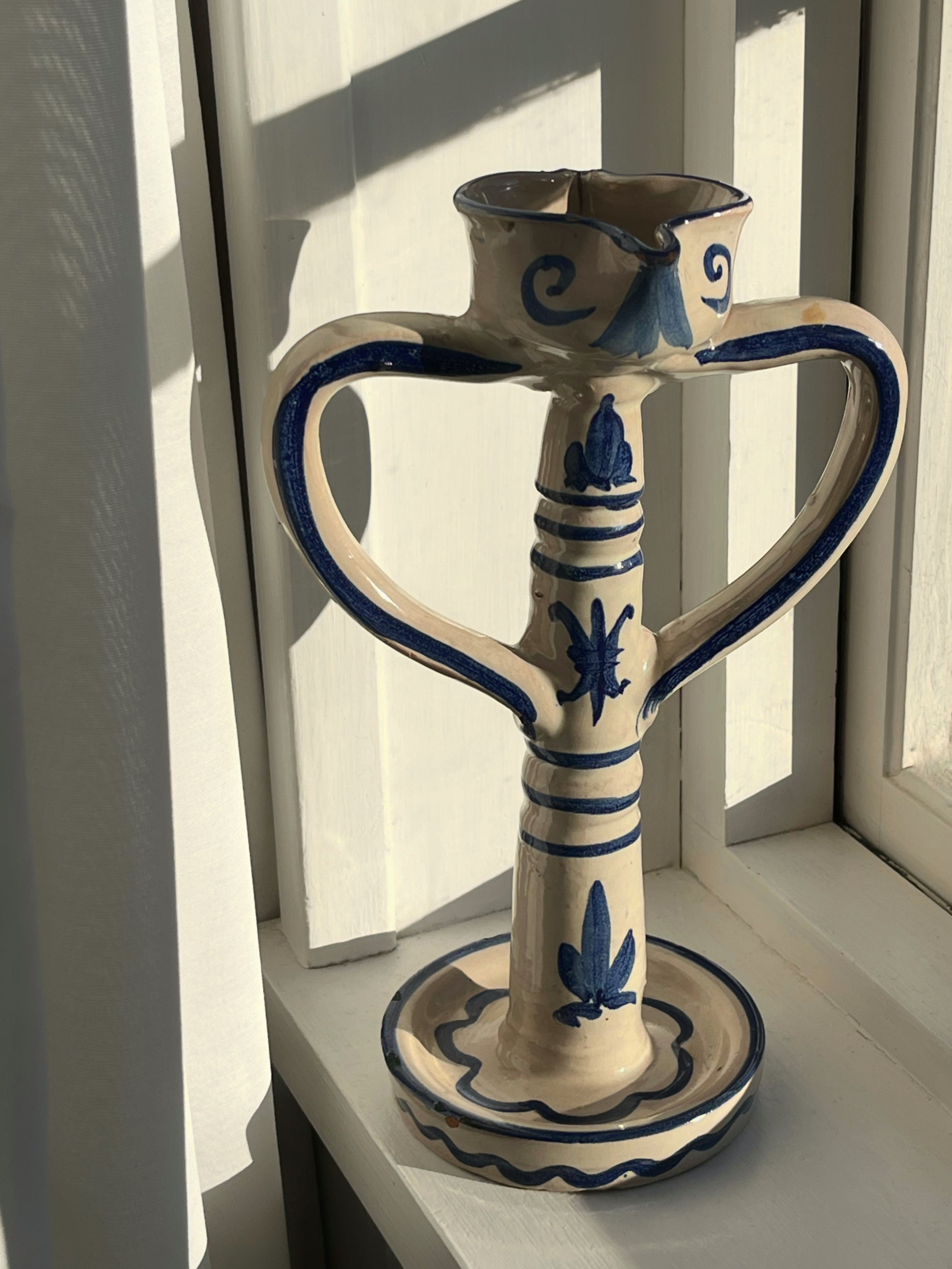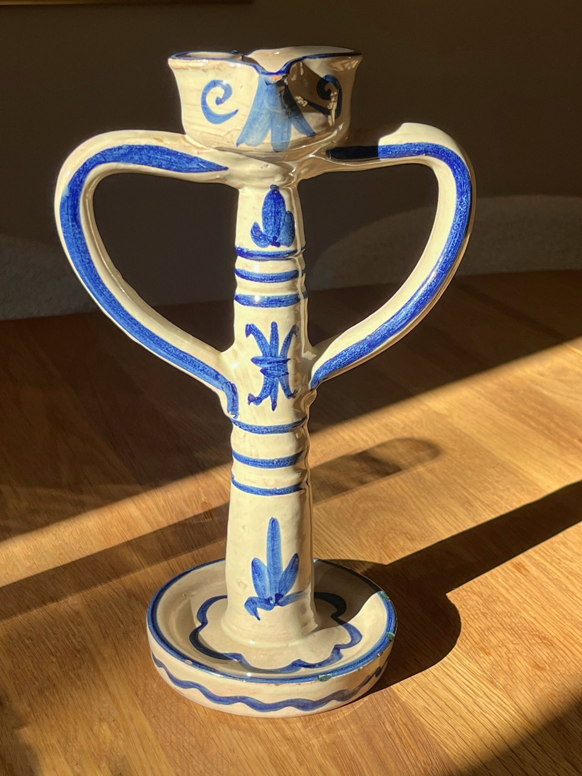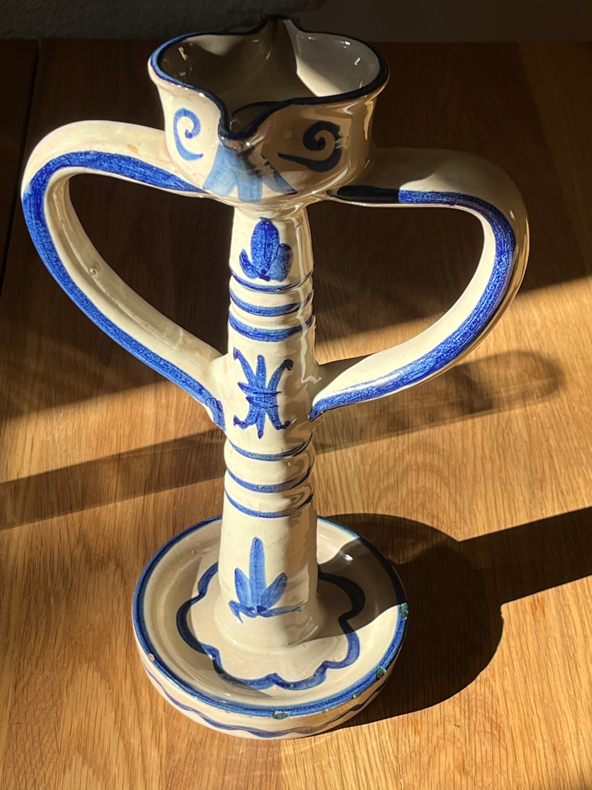 Smuk keramik lysestage med to hanke. Håndlavet og signeret. Da den er håndlavet er lyseholderen formet i hånden og den er lidt svært at få et stearinlys til at passe.