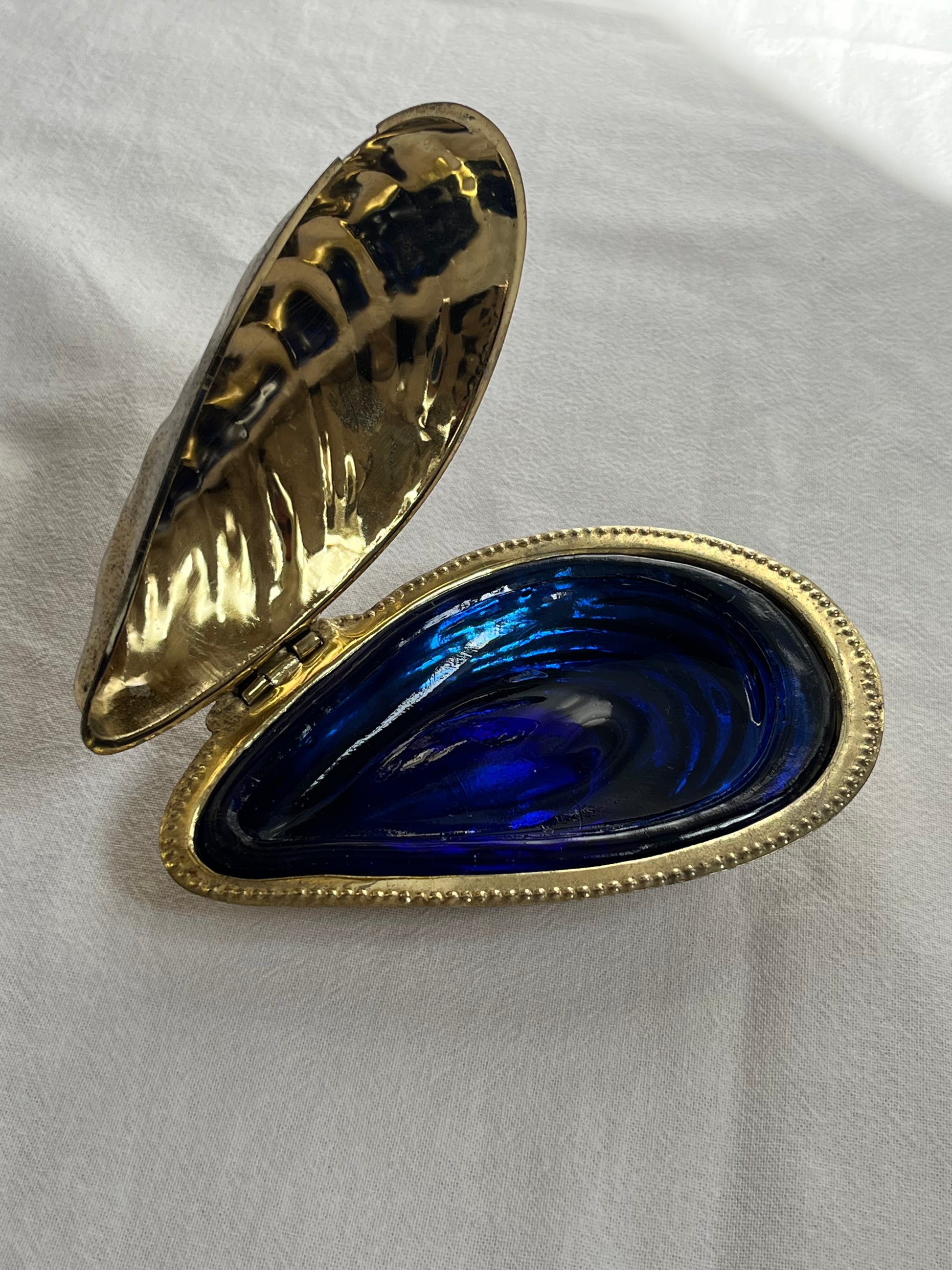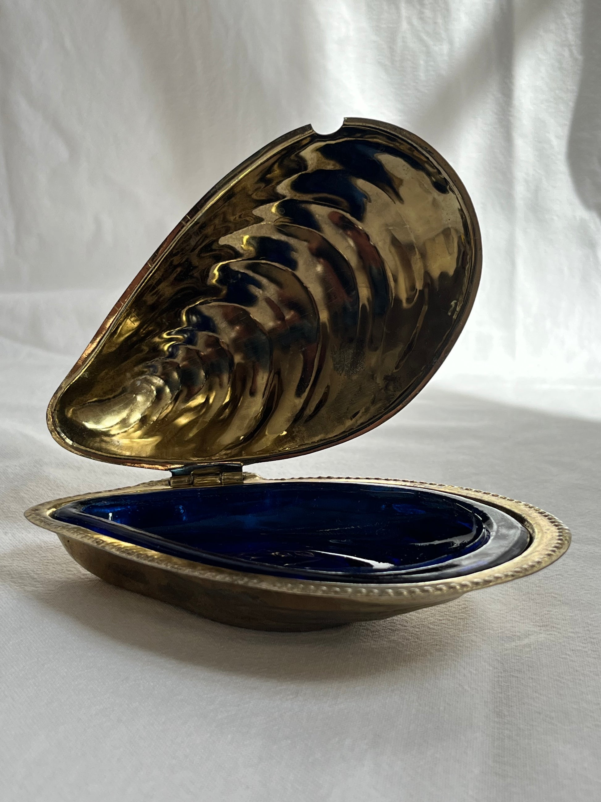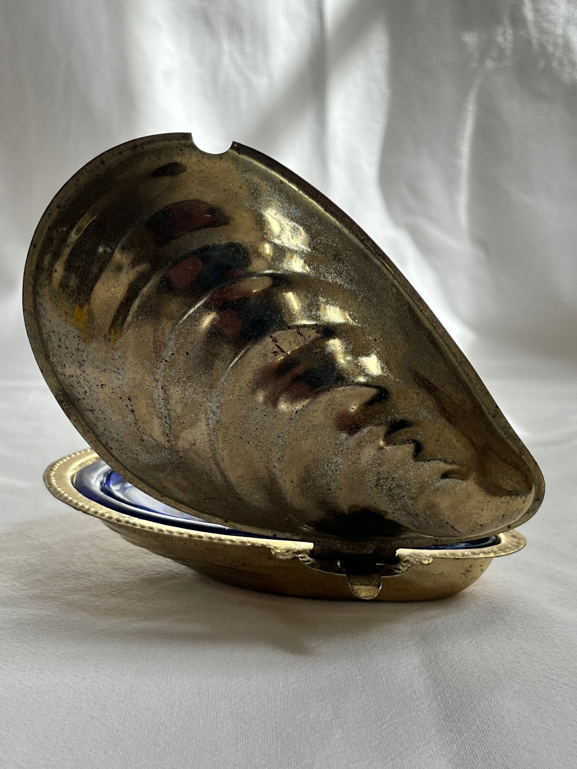 Beholder formet som blåmusling i messing med blå glasindsats. Originalt været brugt til smør eller caviar.