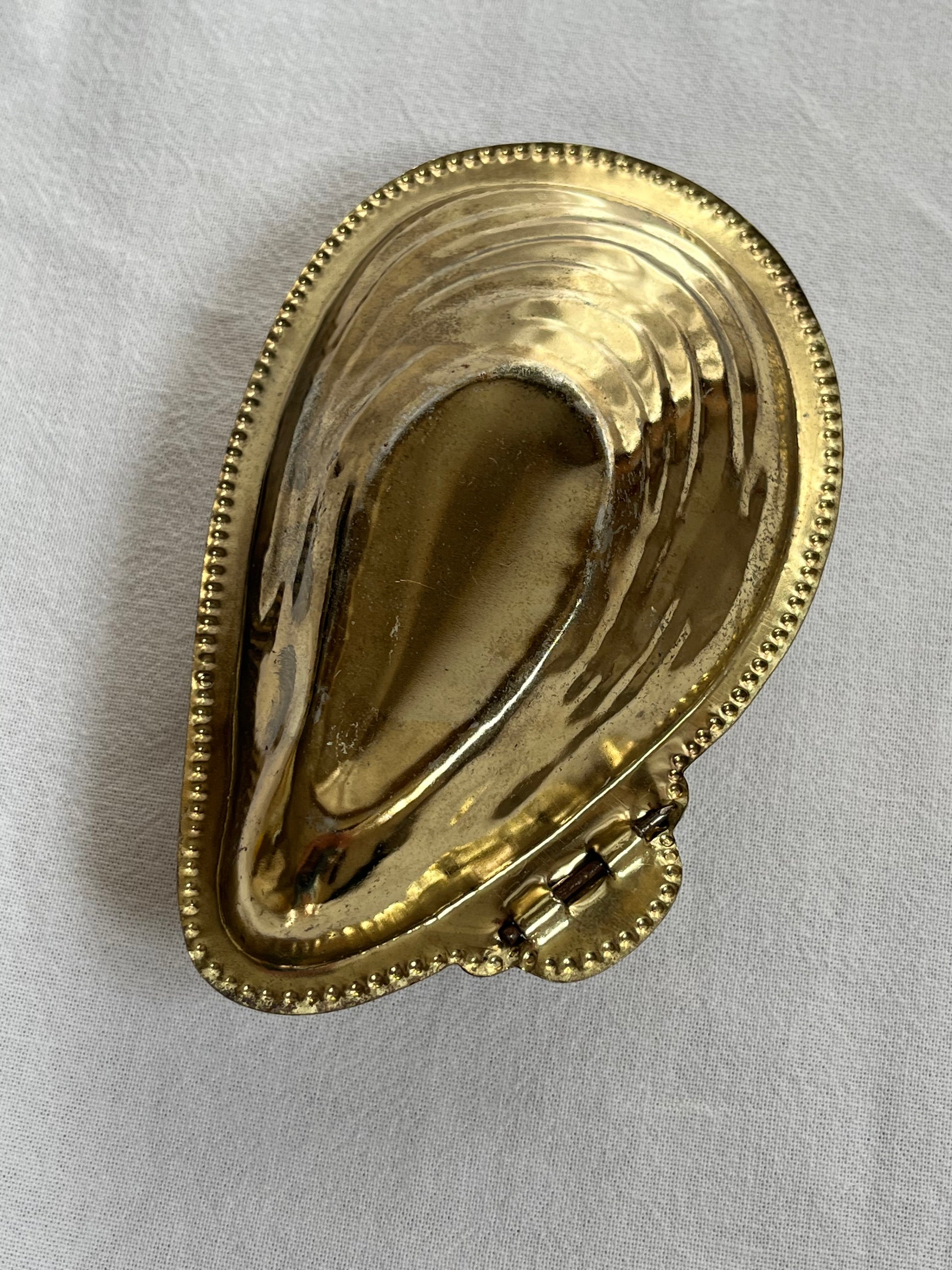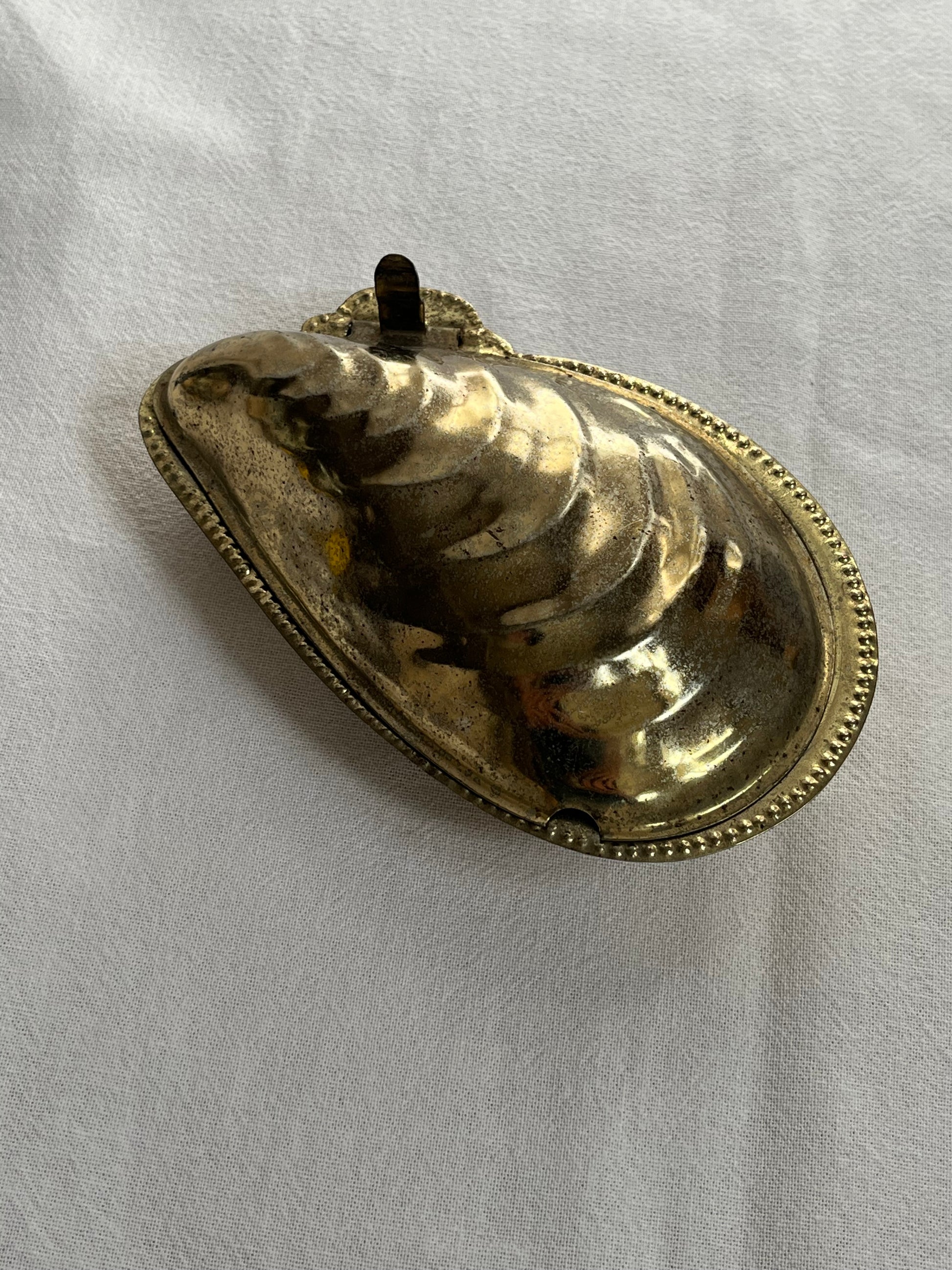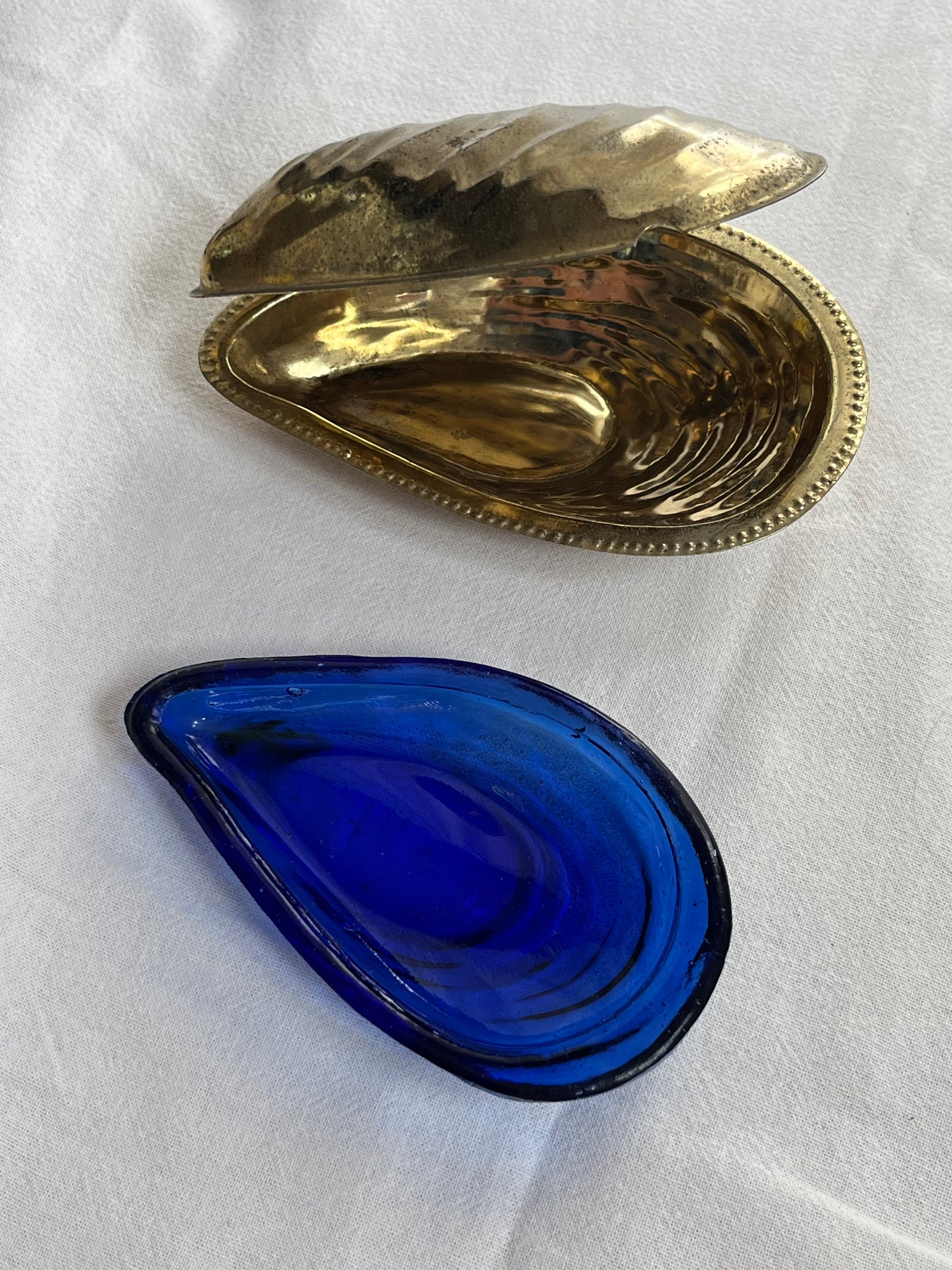 Beholder formet som blåmusling i messing med blå glasindsats. Originalt været brugt til smør eller caviar.