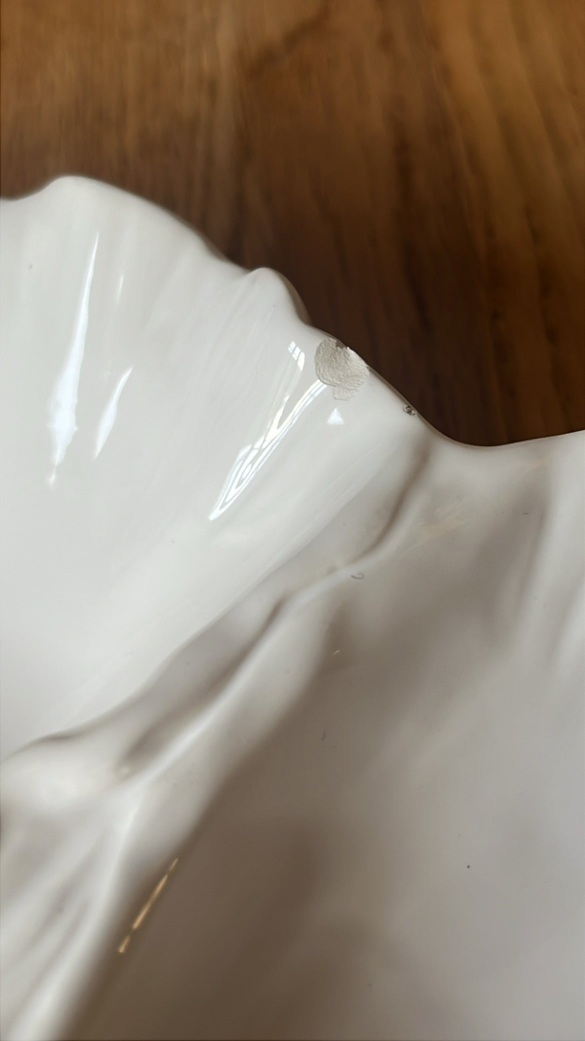 Skål / fad med tre seperste rum formet som tre muslingeskaller. Med patina. Har lille afslag - se billede.