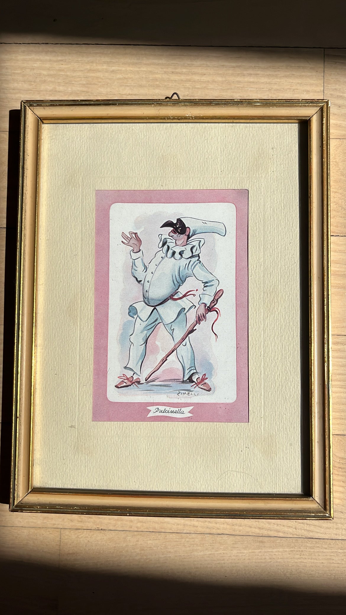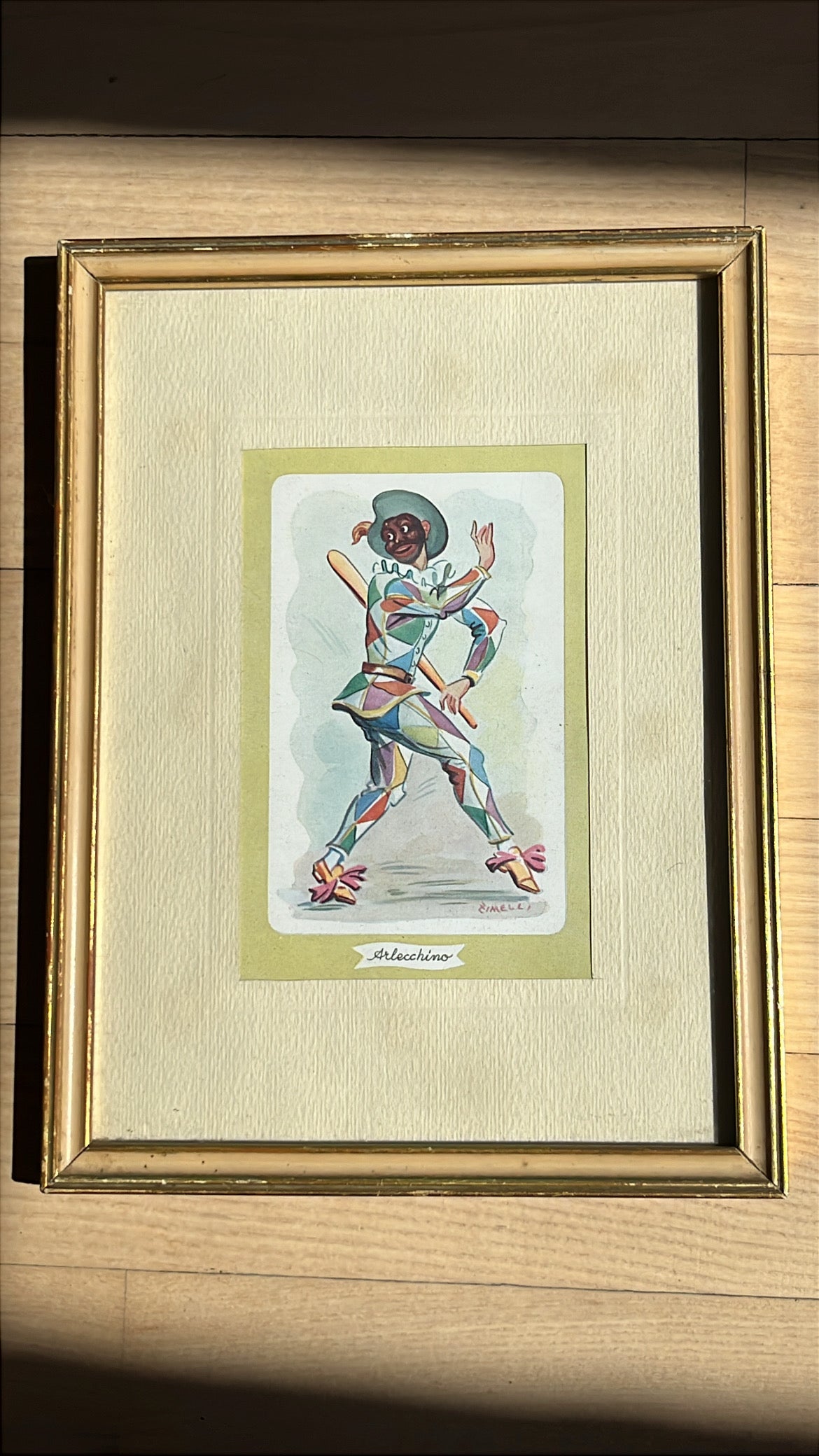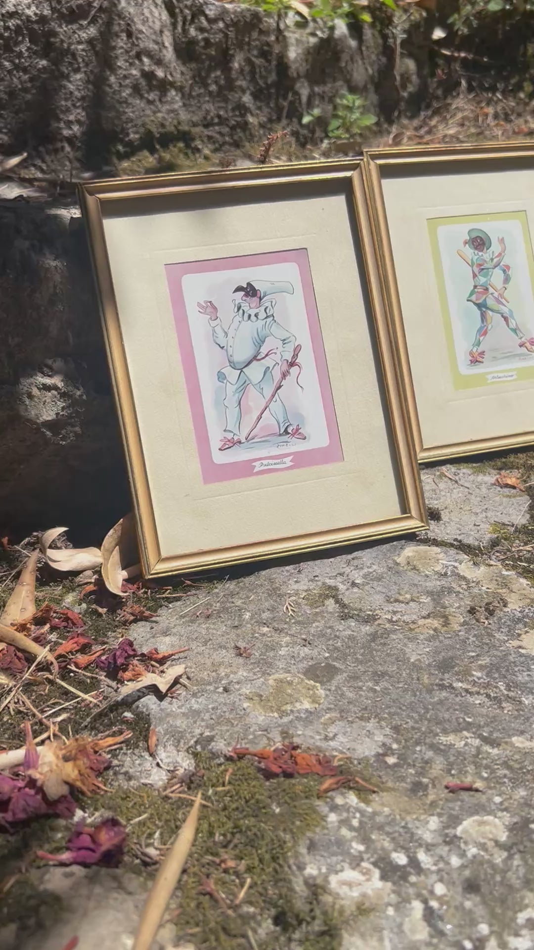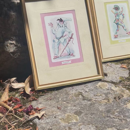 To fine tryk i messingrammer. Motiv af harlekin og hofnar. Sælges som sæt. Prisen er for begge.