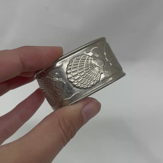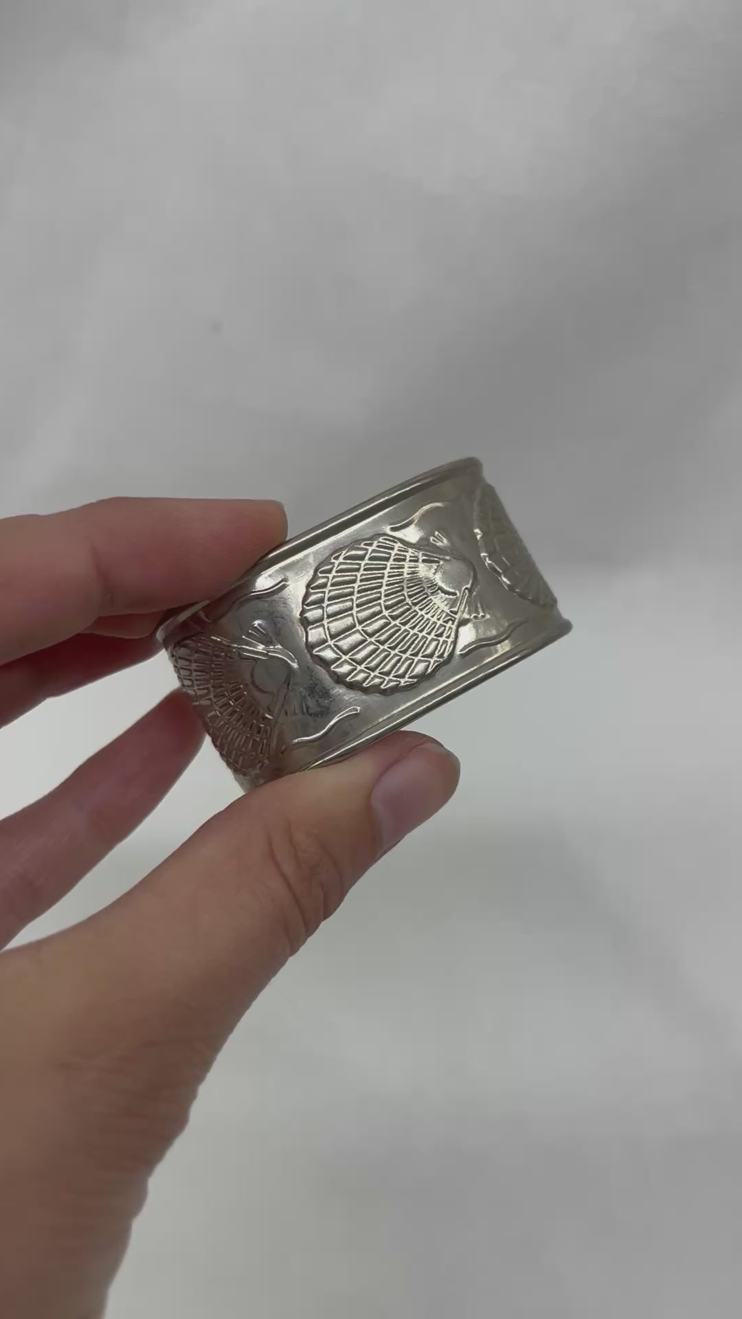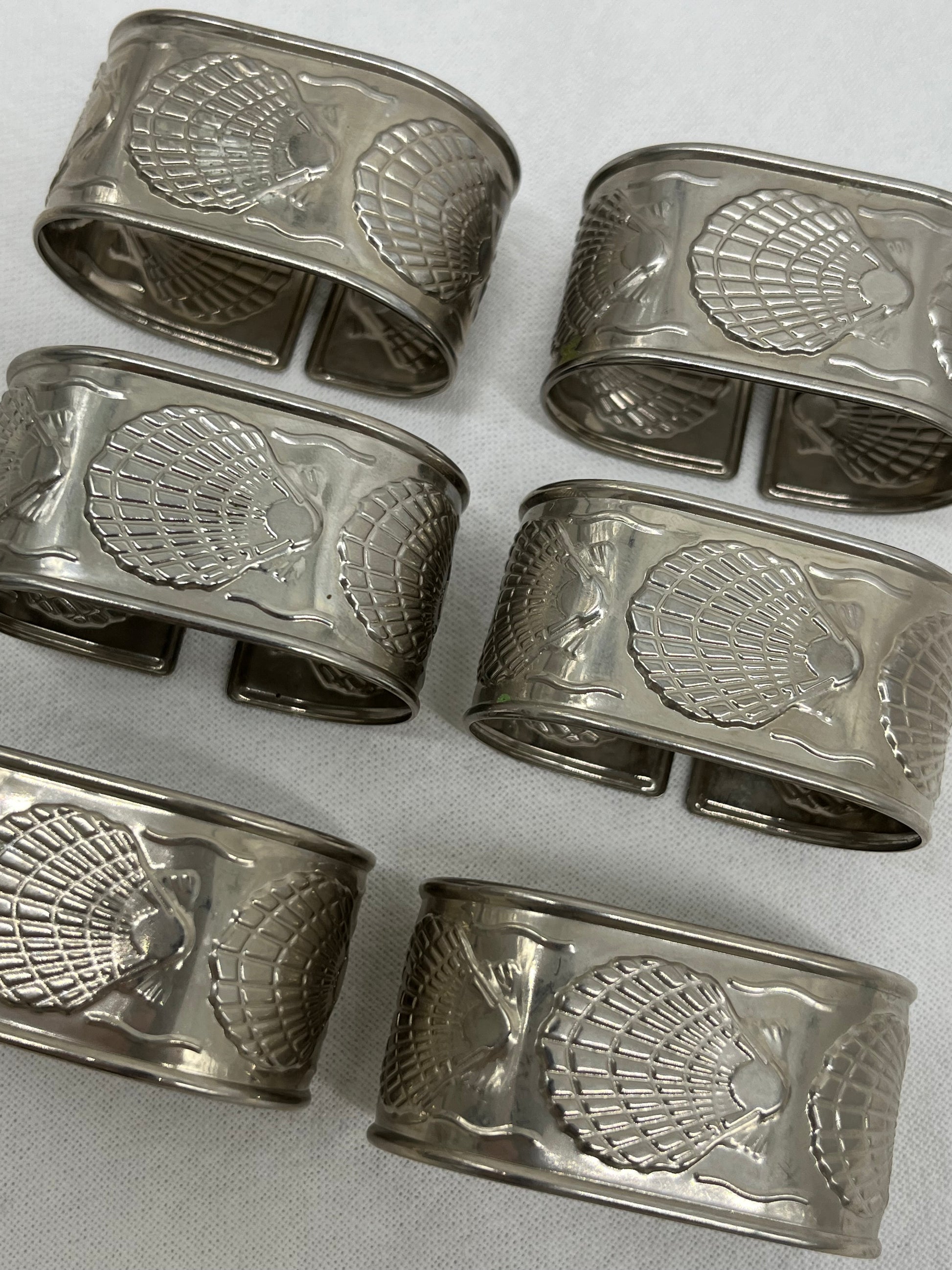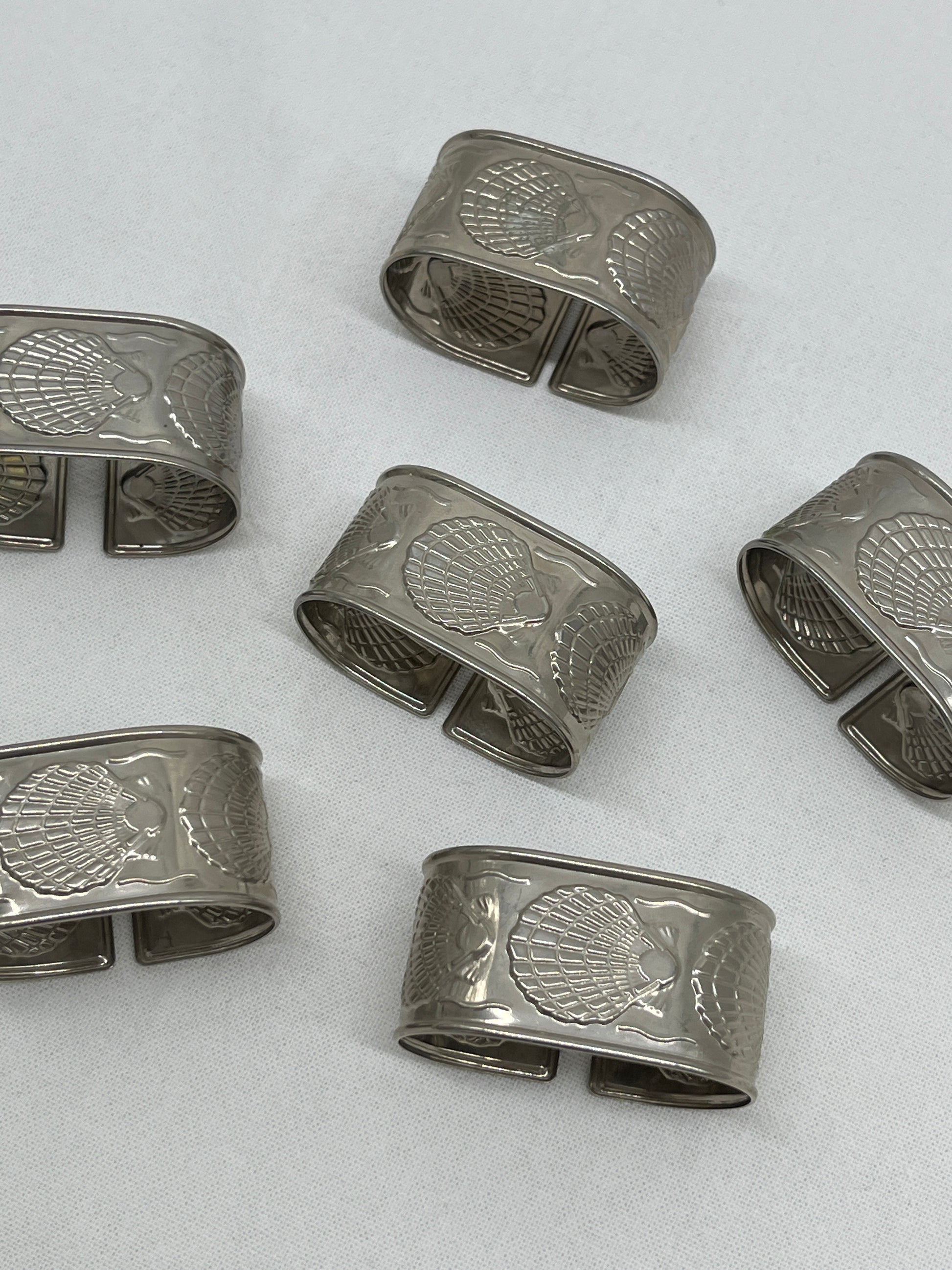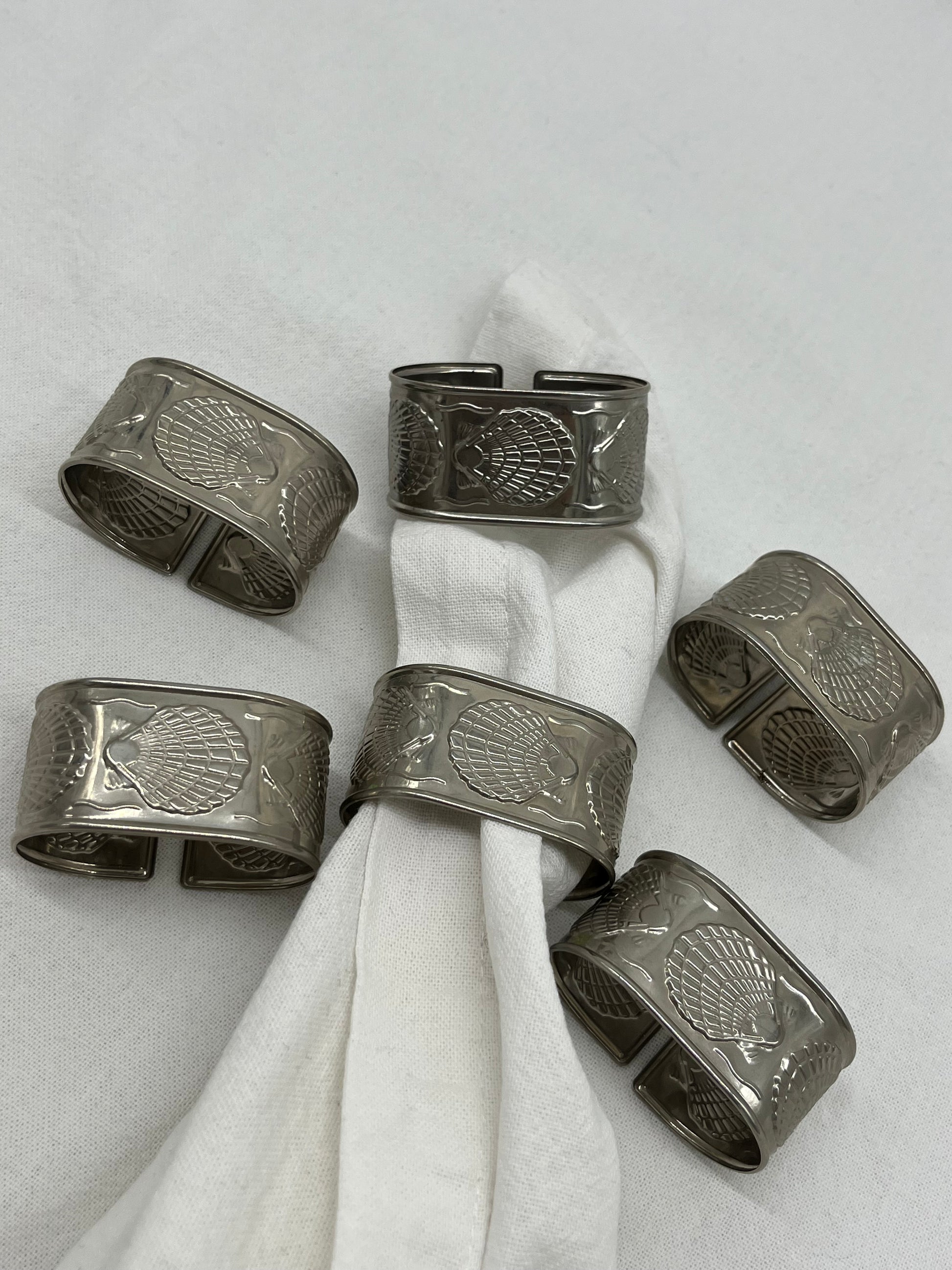 Stål servietringe med musling motiv. Sælges i sæt af 6 stk samlet.