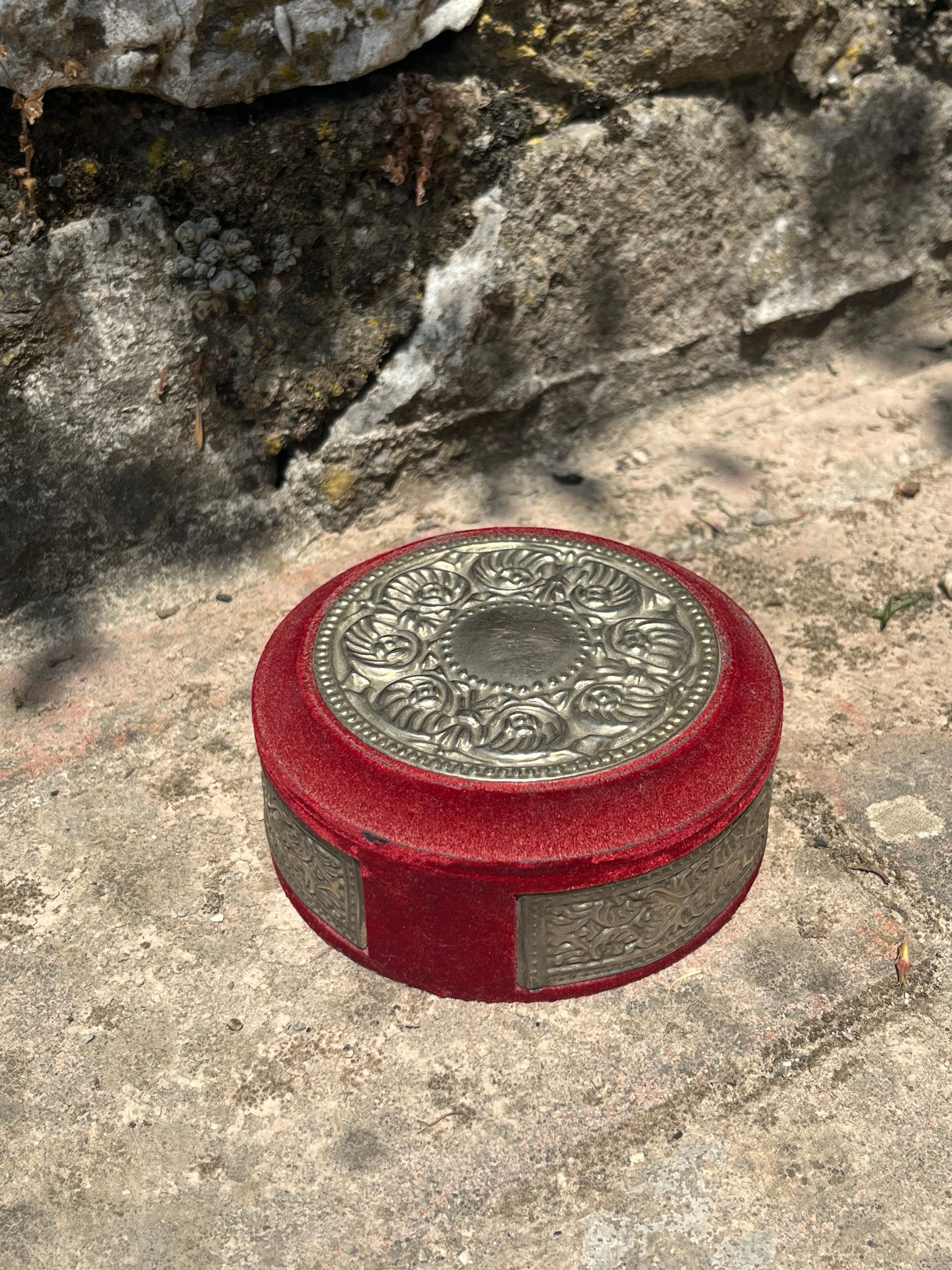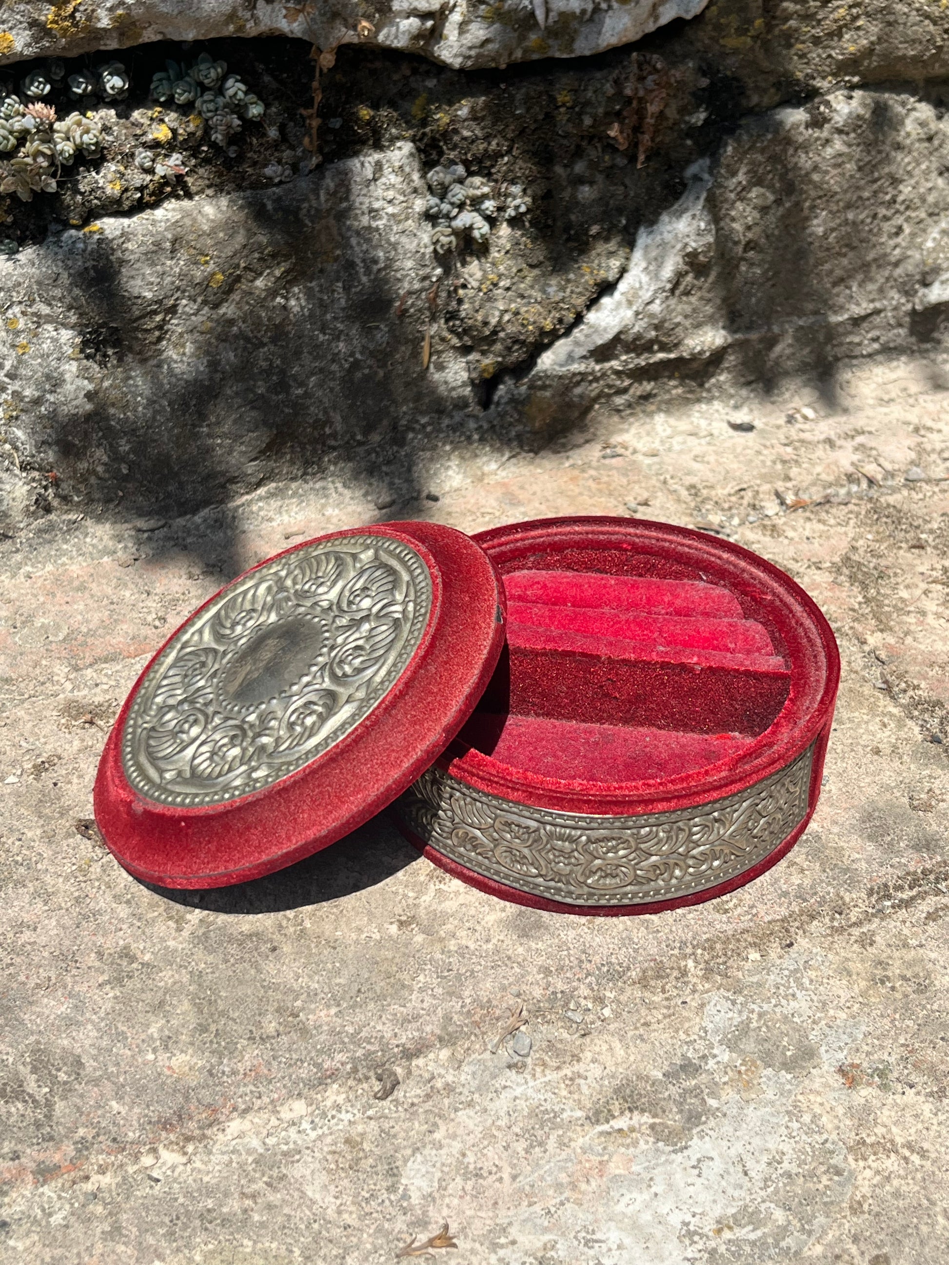 Bordeaux velour æske med sølvplet detaljer. Har inddeling til smykker indvendigt. Har brugsspor.