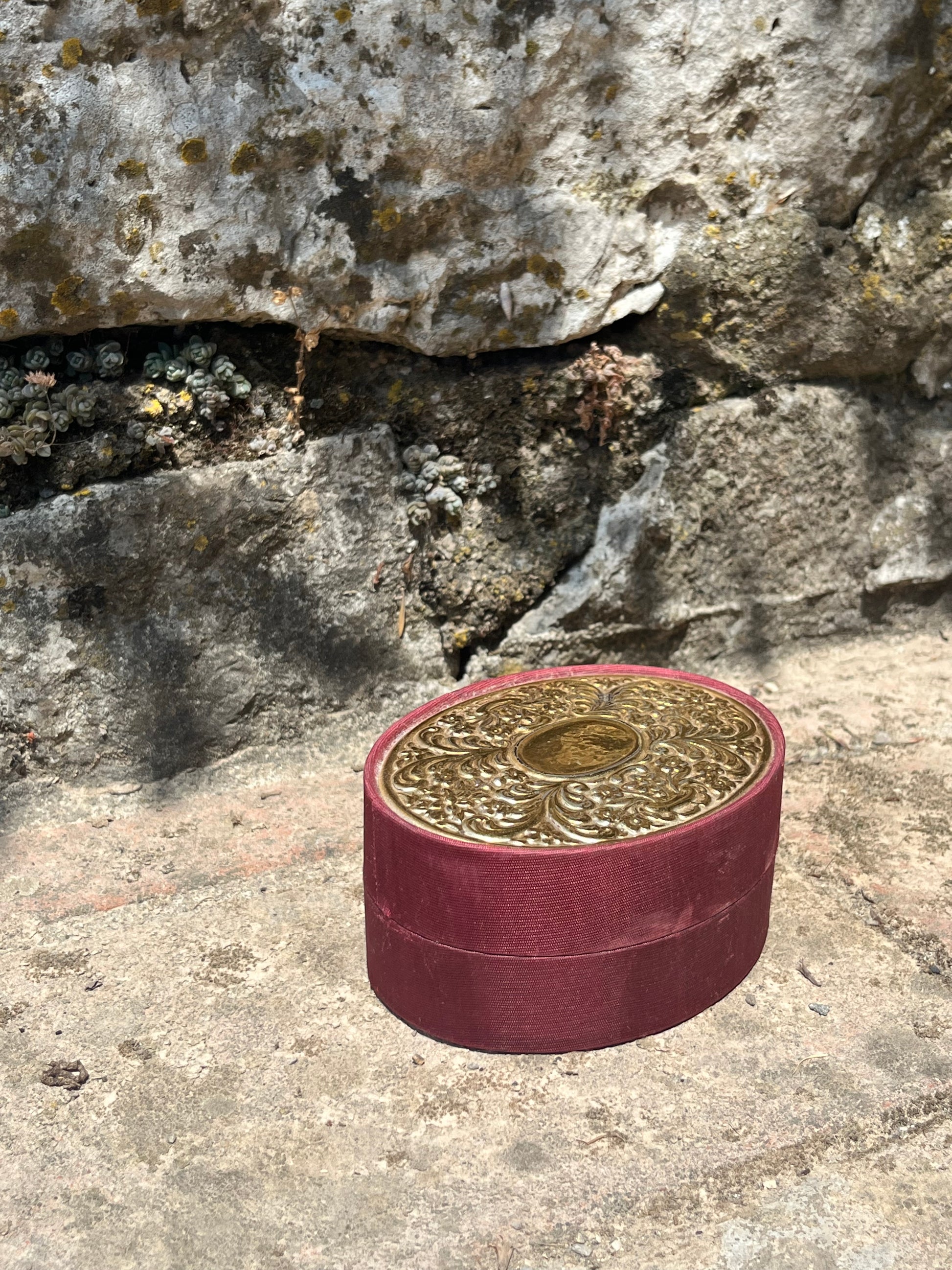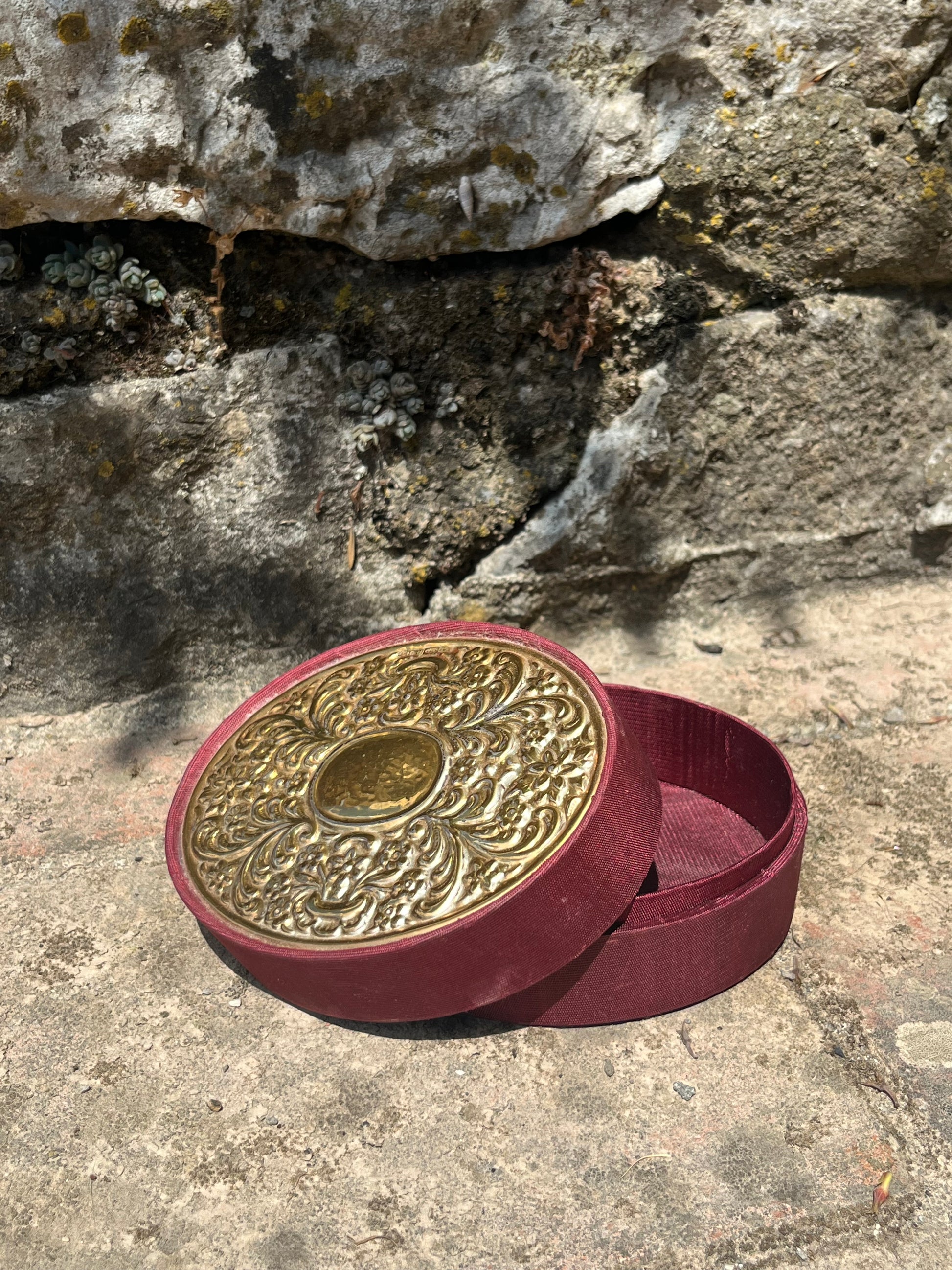 Fin lille bordeaux smykkeæske i stof med messingdetaljer (stemplet). Har brugsspor.