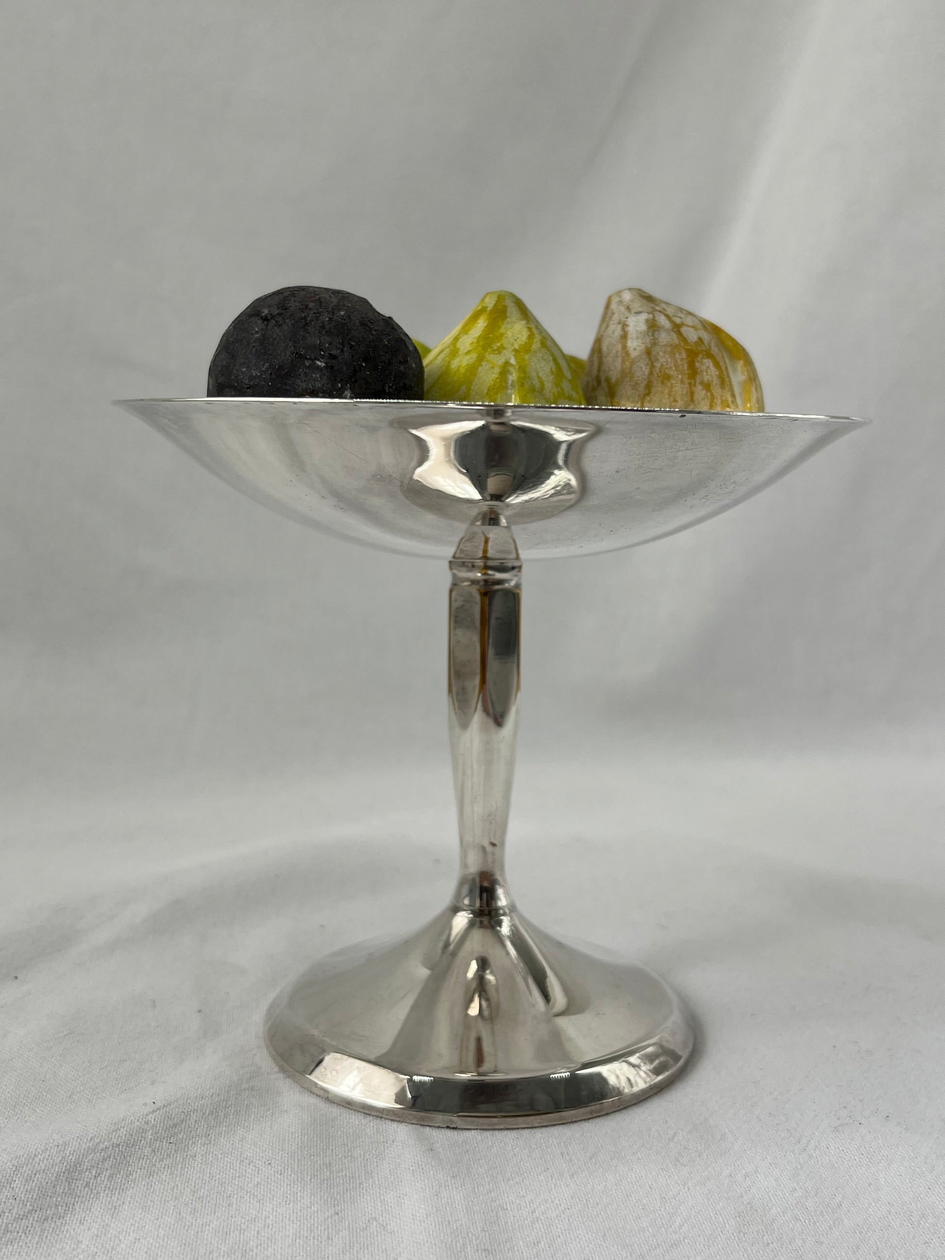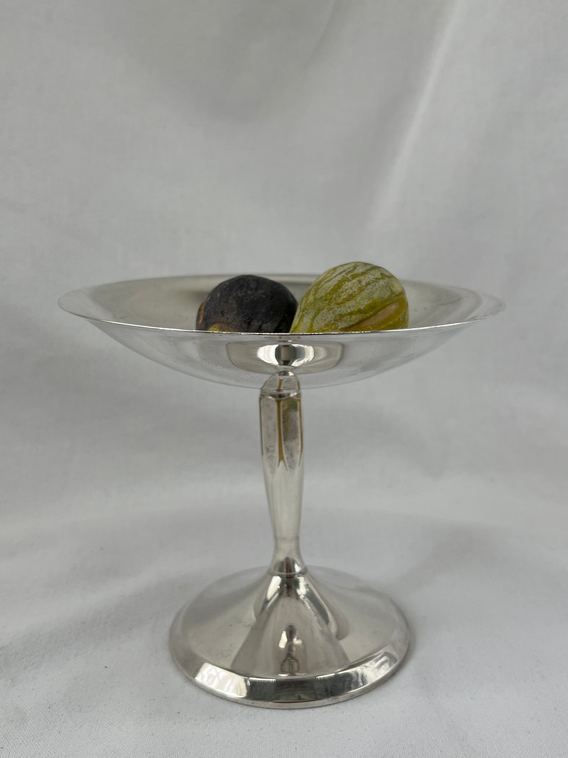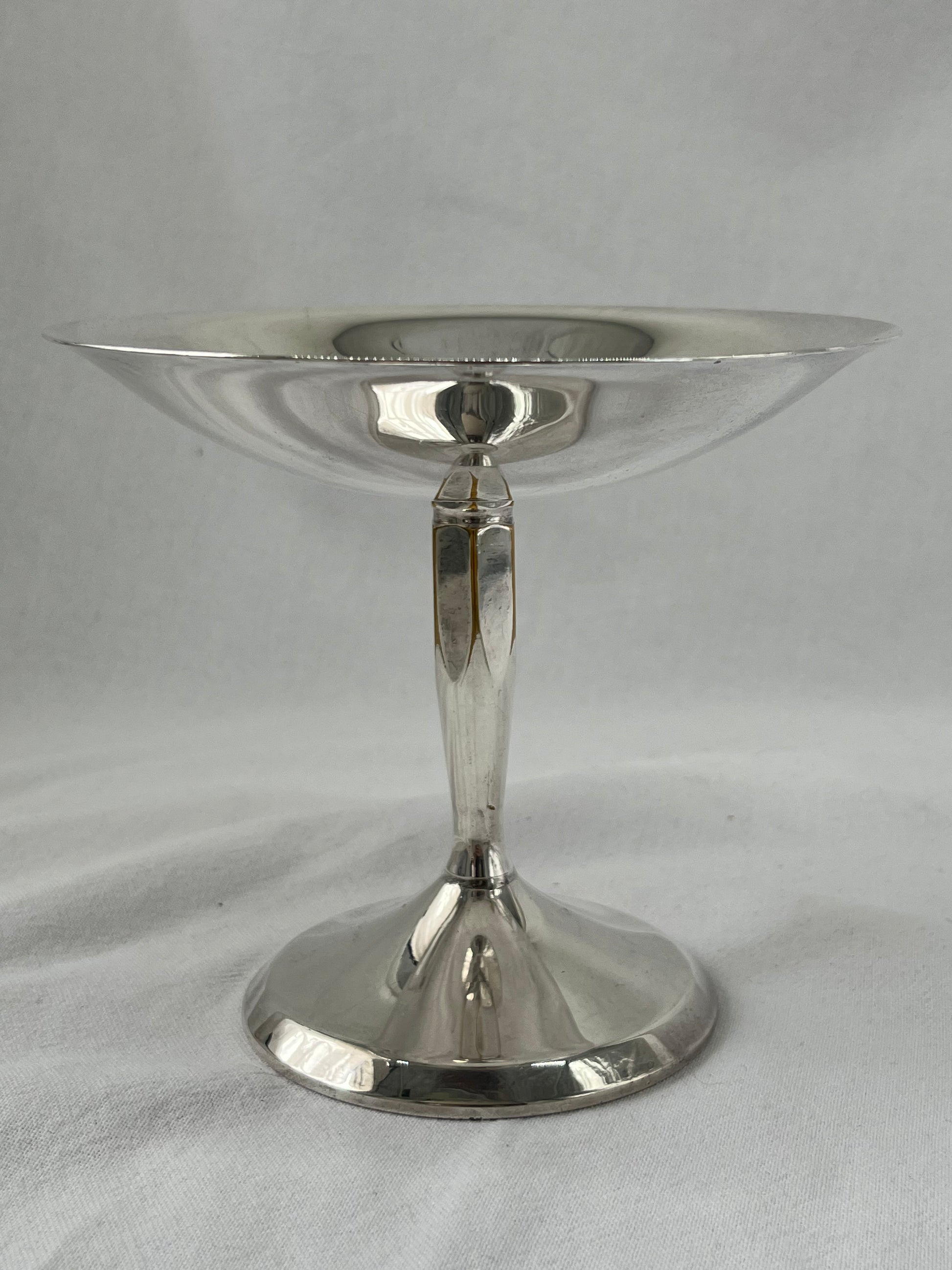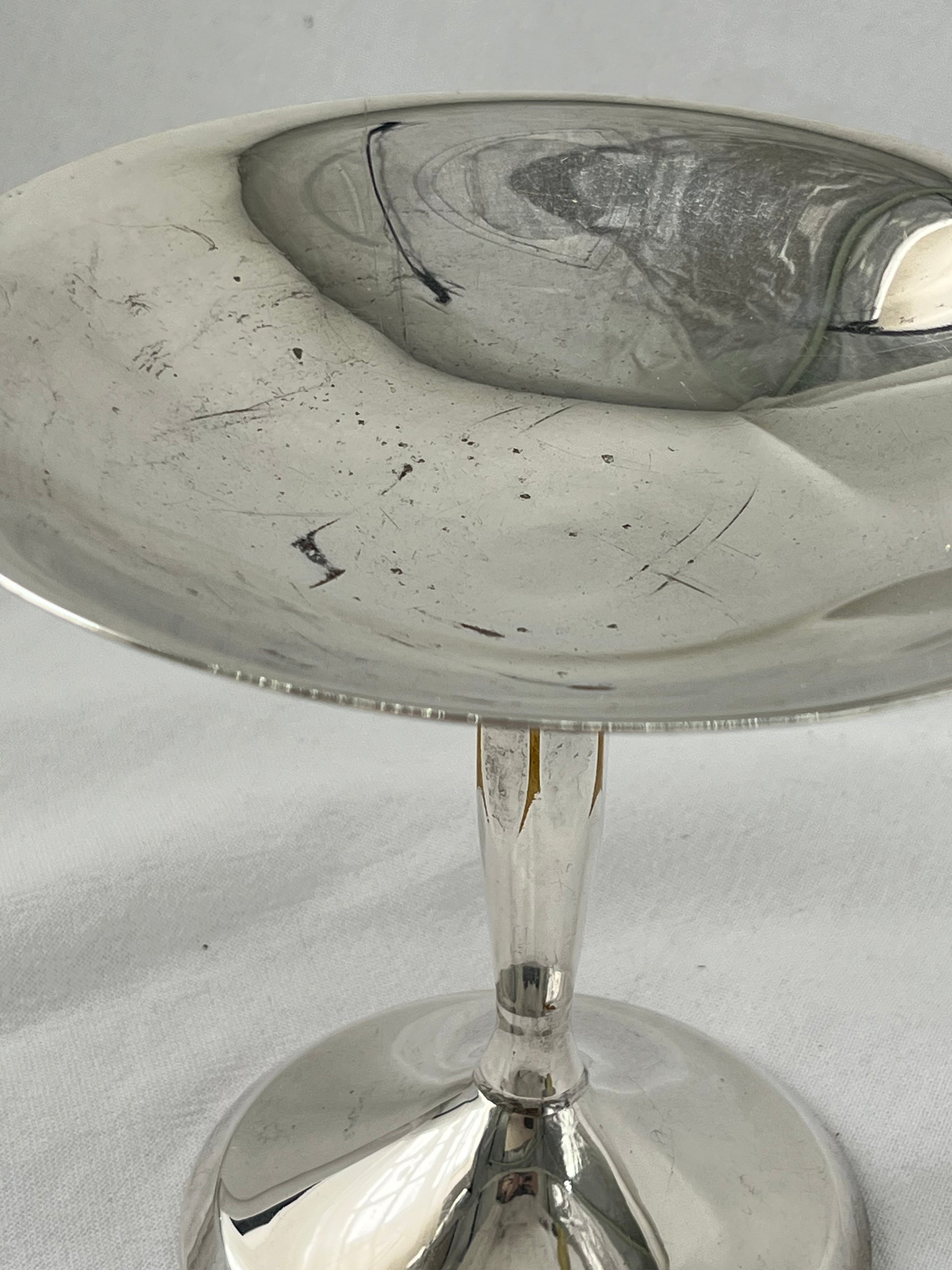 Kun let pudset, da patina klæder den. Har lidt skrammer i skålen og sølvplet slidt på stilken.
