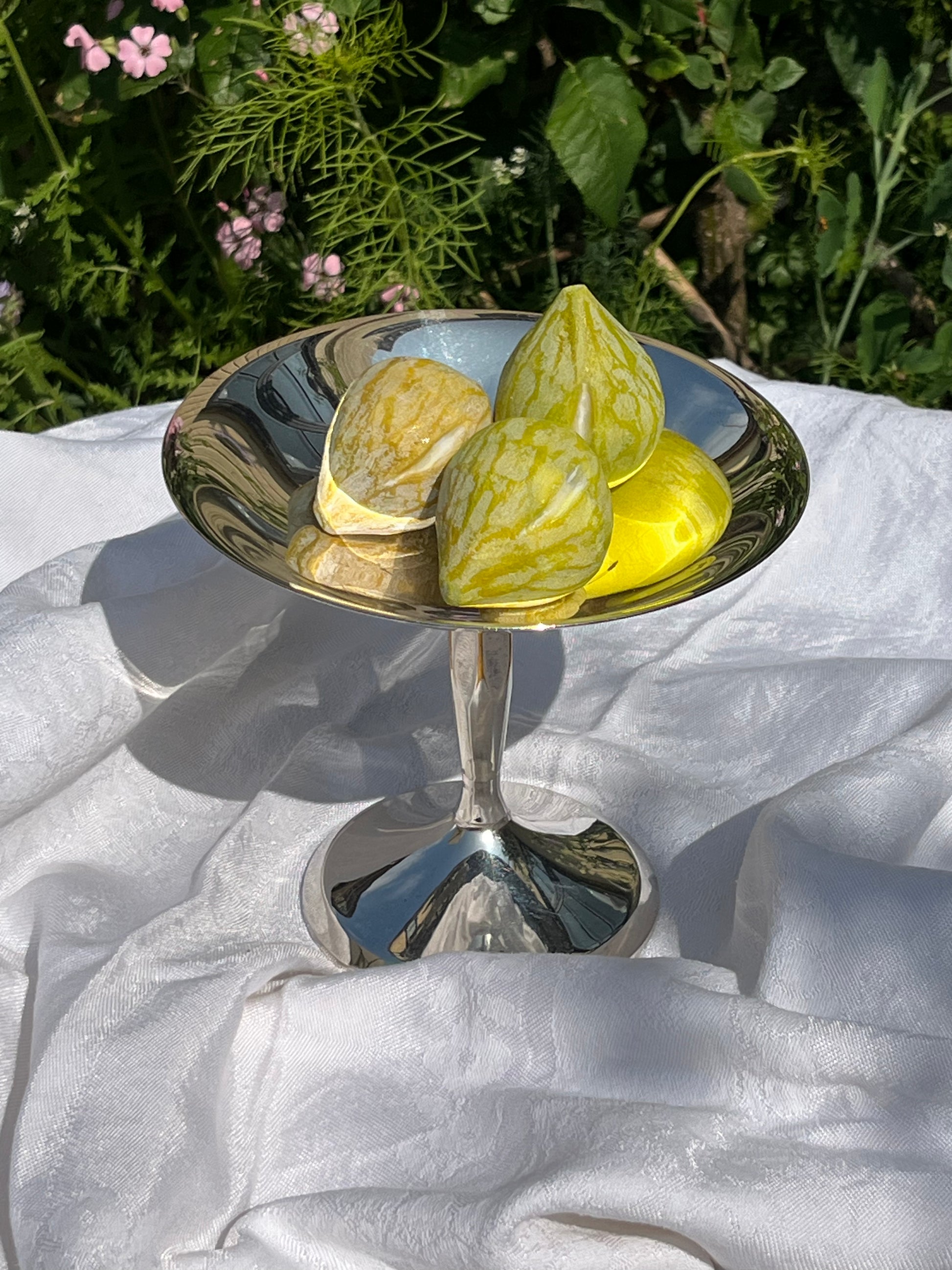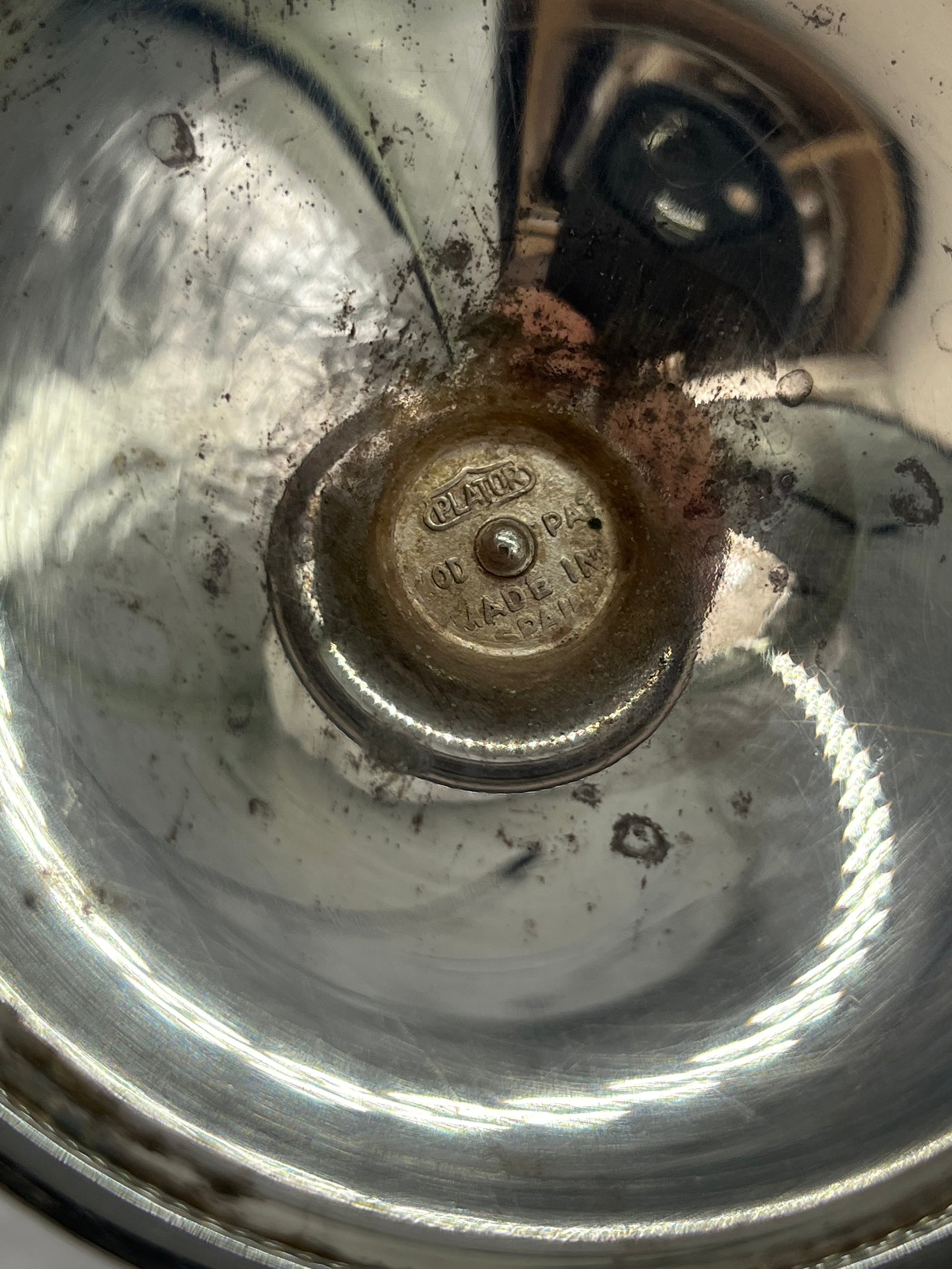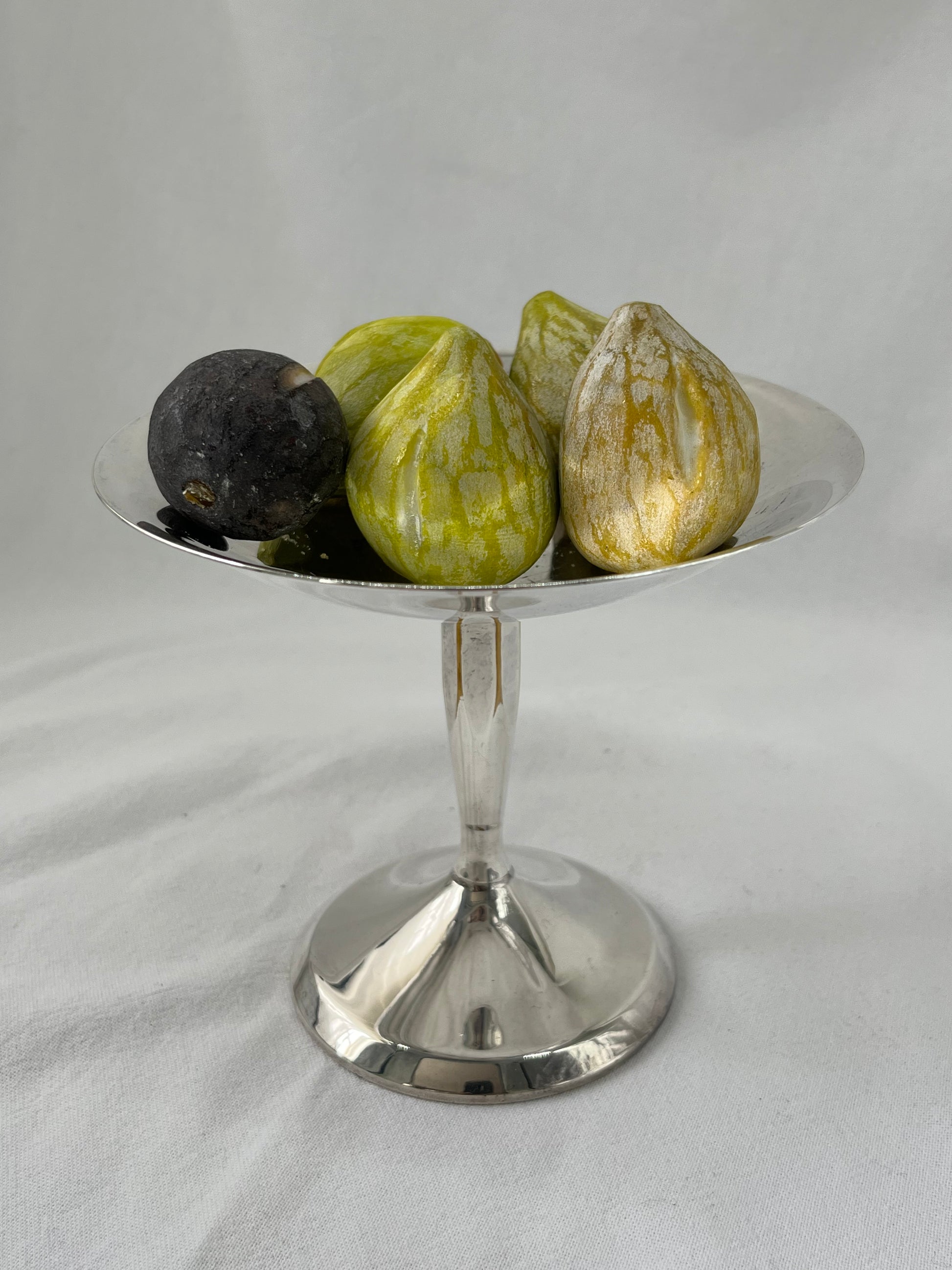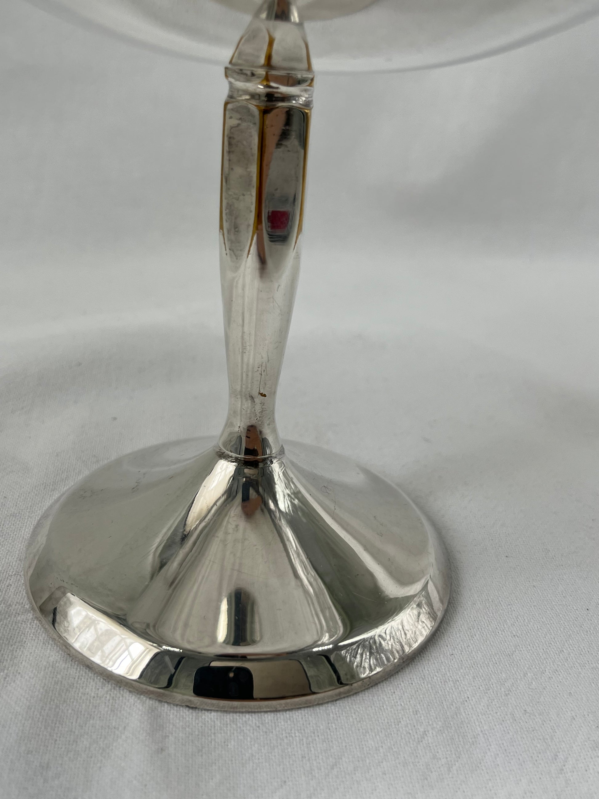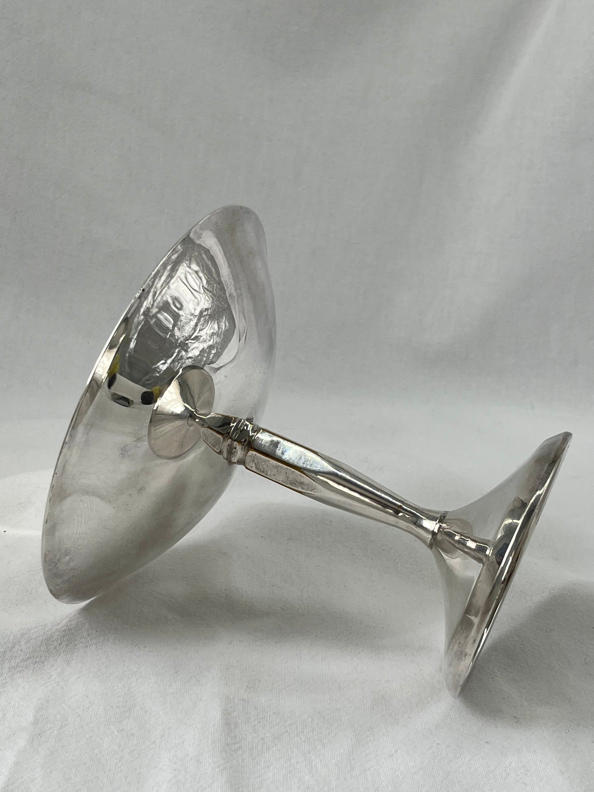 Kun let pudset, da patina klæder den. Har lidt skrammer i skålen og sølvplet slidt på stilken.