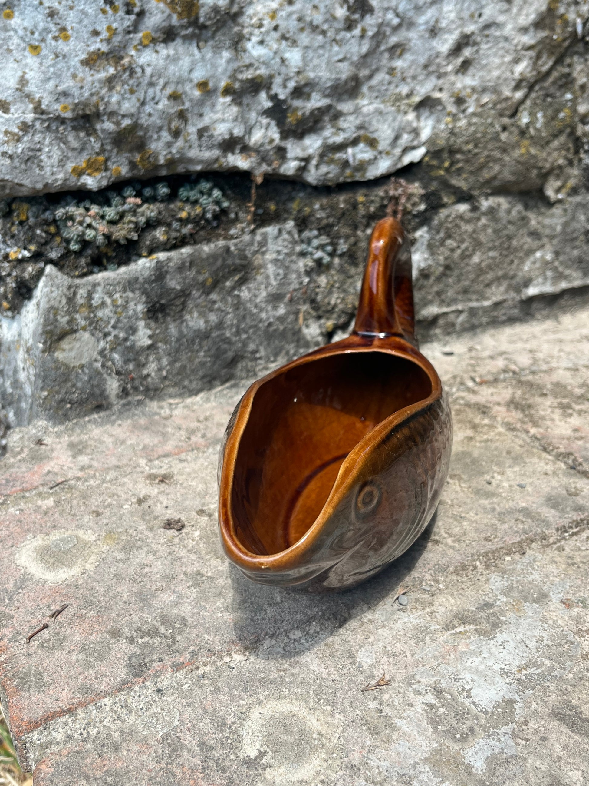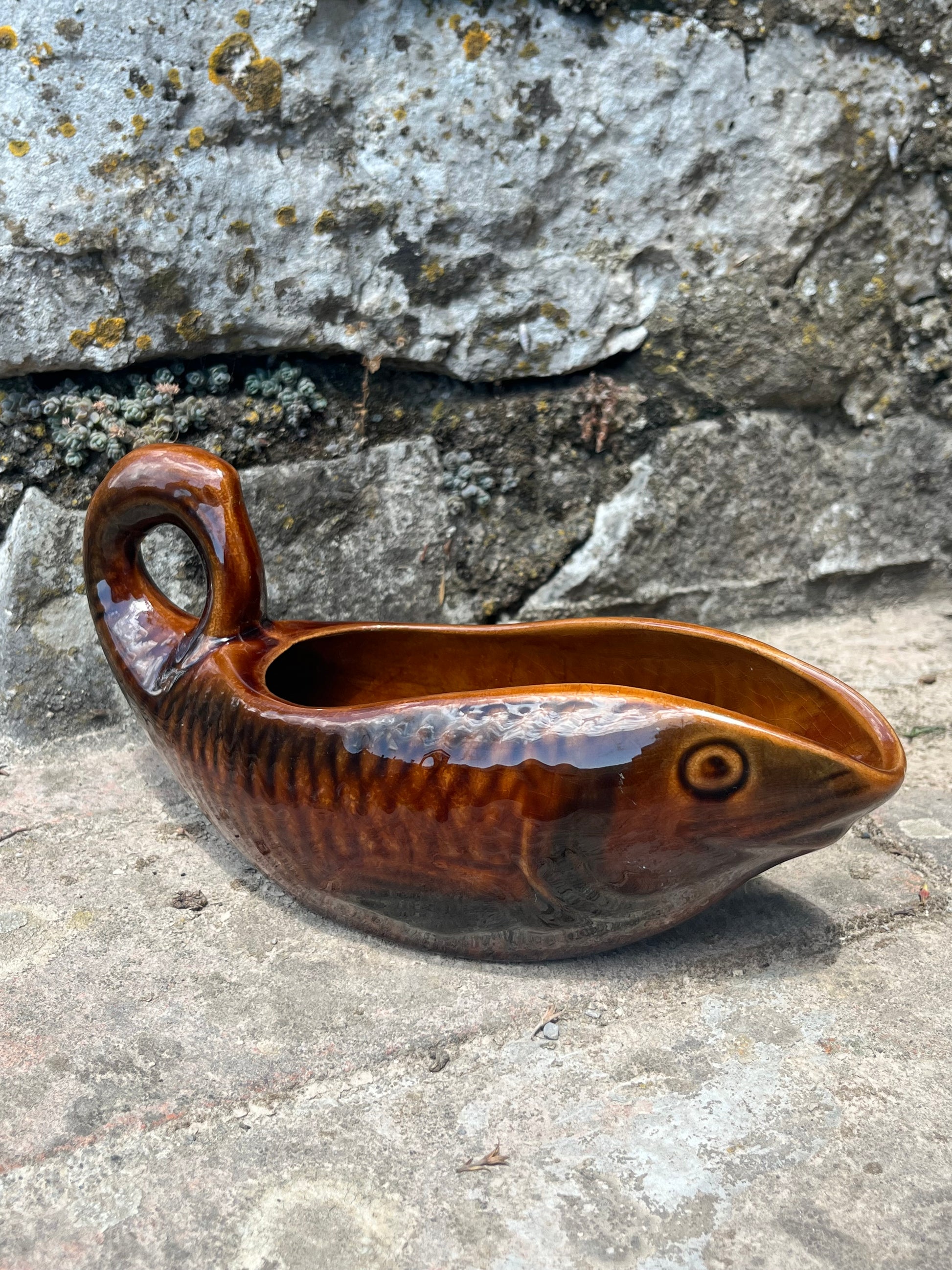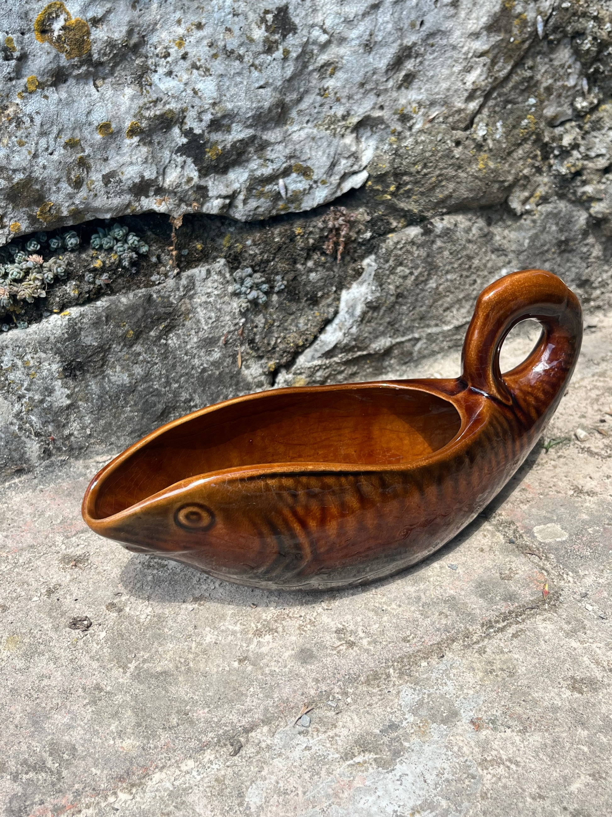 Fiskeformet sovsekande fra franske sarreguemines fajance i flot brun farve.