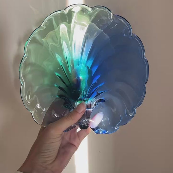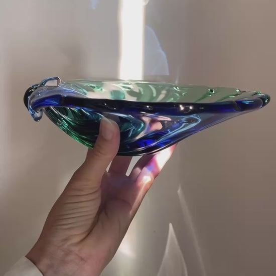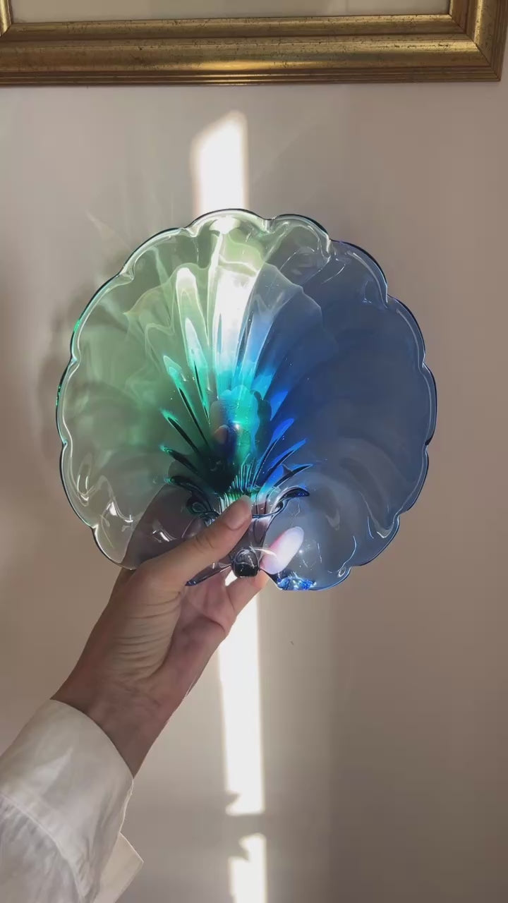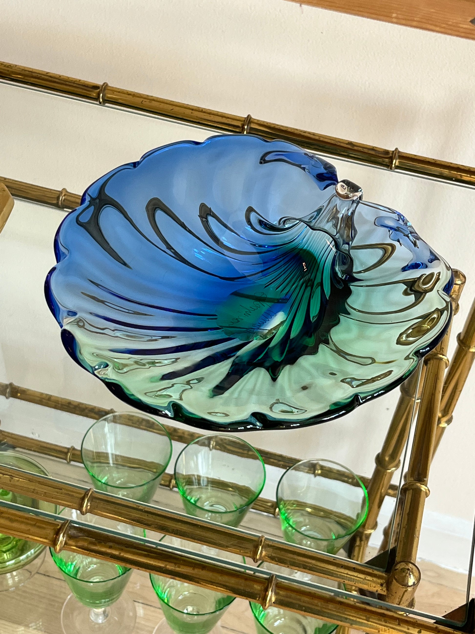 Unik Murano skål, formet som musling i grønt og blåt glas. Perfekt stand. Signeret af kunstner Gianni Barbican. Fra ca 1970’erne.