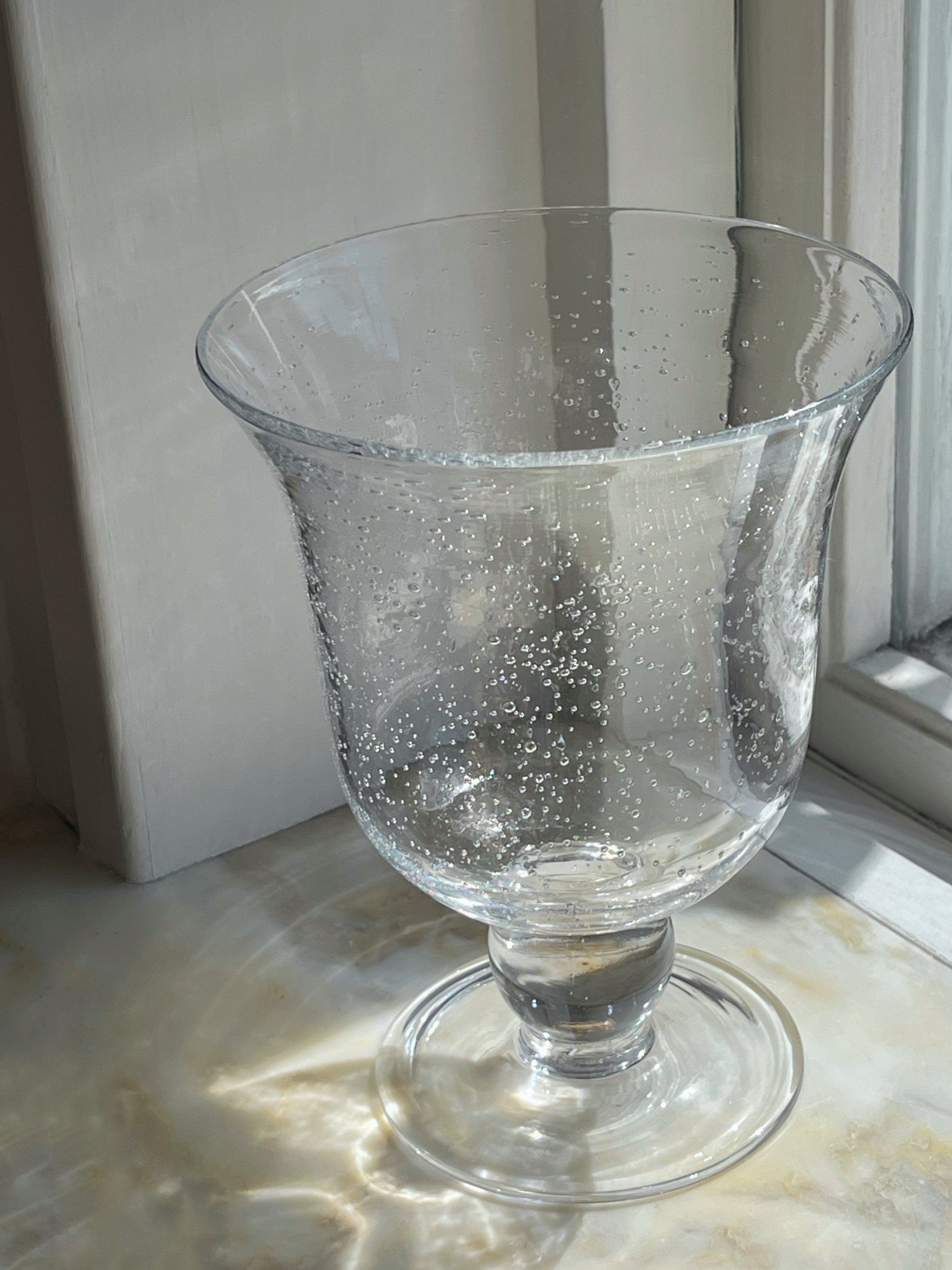 Mundblæst glasvase på fod med bobler i glasset.