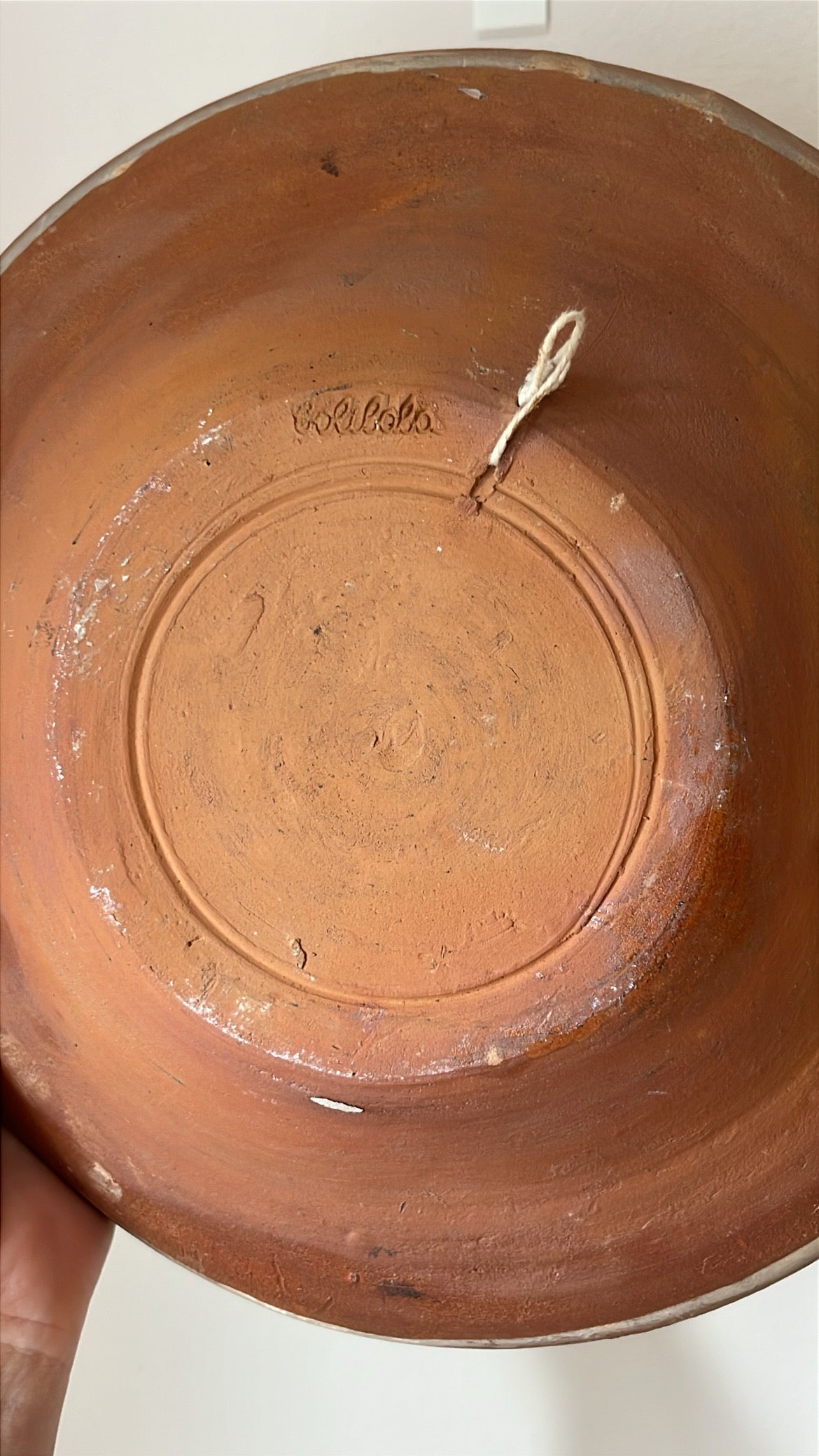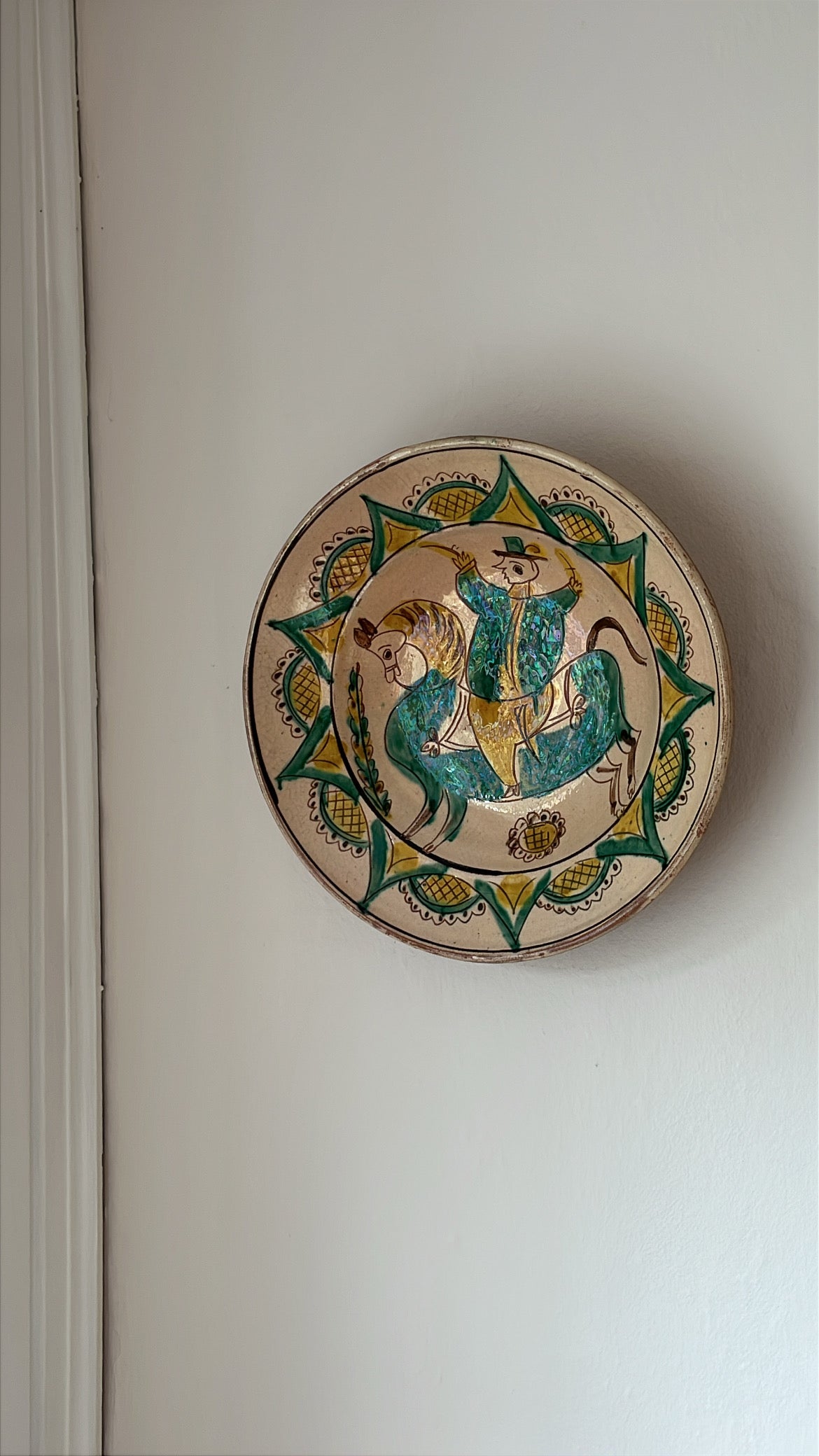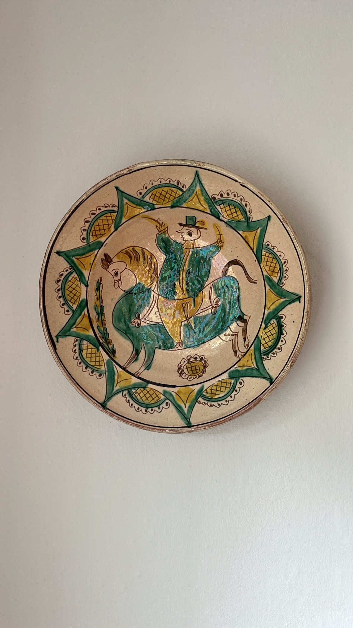 Smuk vægtallerken / keramik skål. Kuty skål signeret af Colibaba. Rytter og hest motiv i gul og grøn glasur.