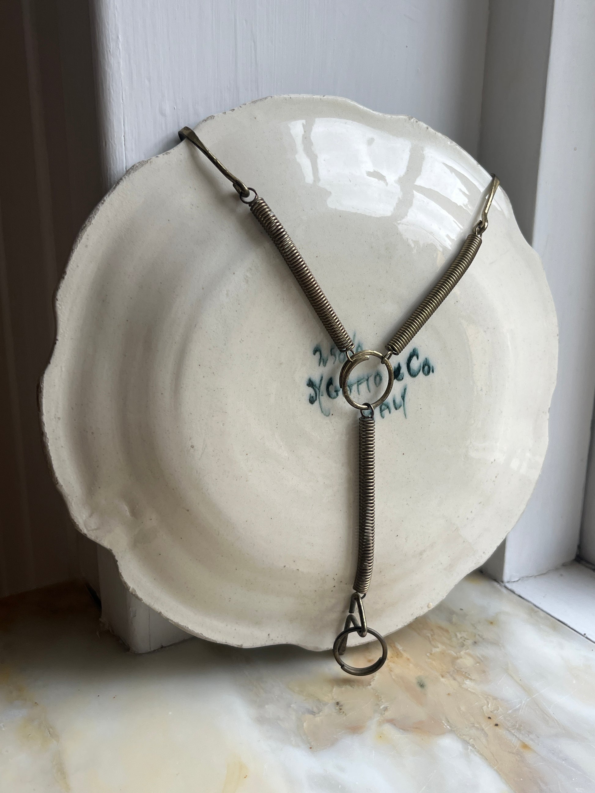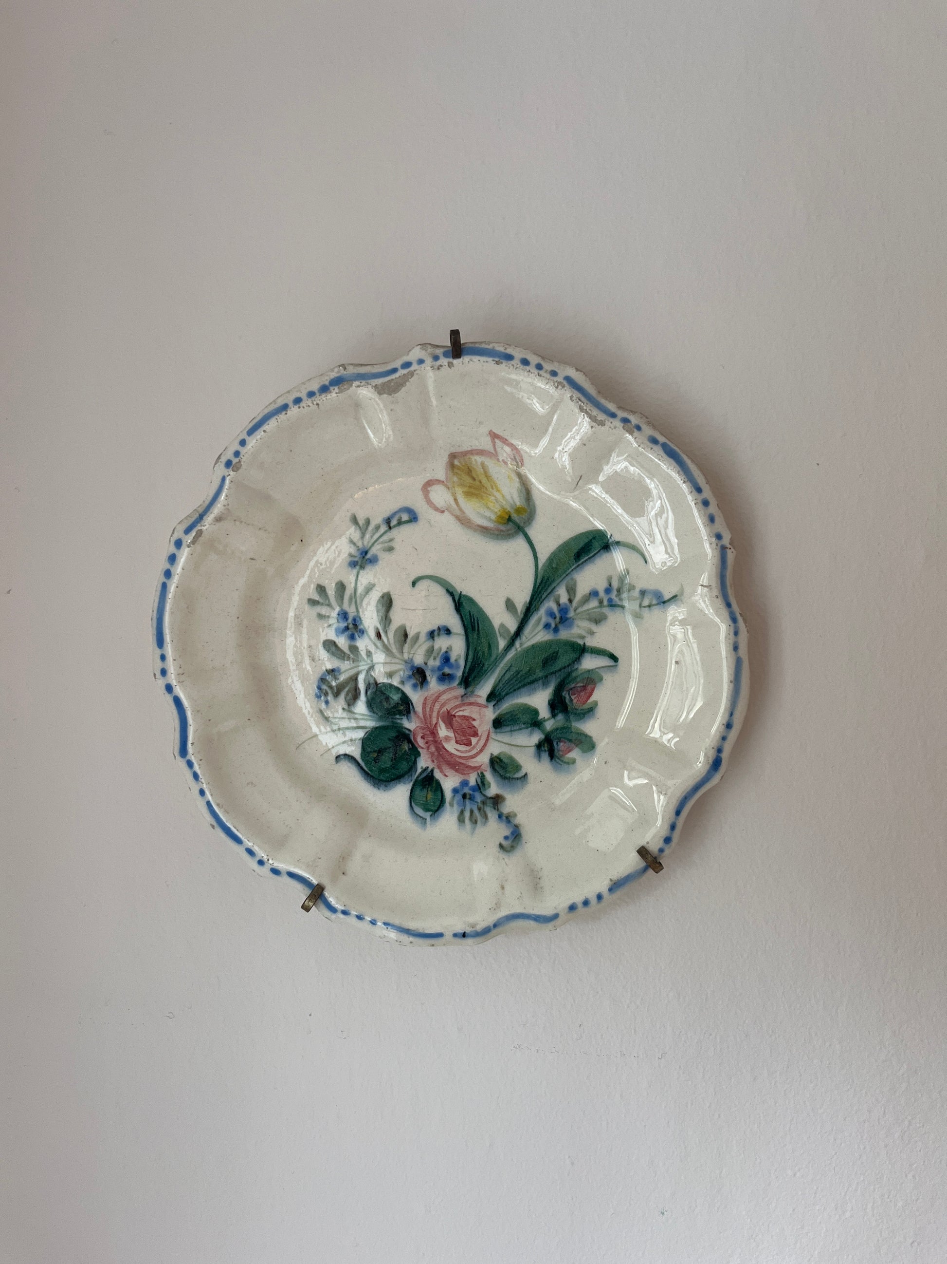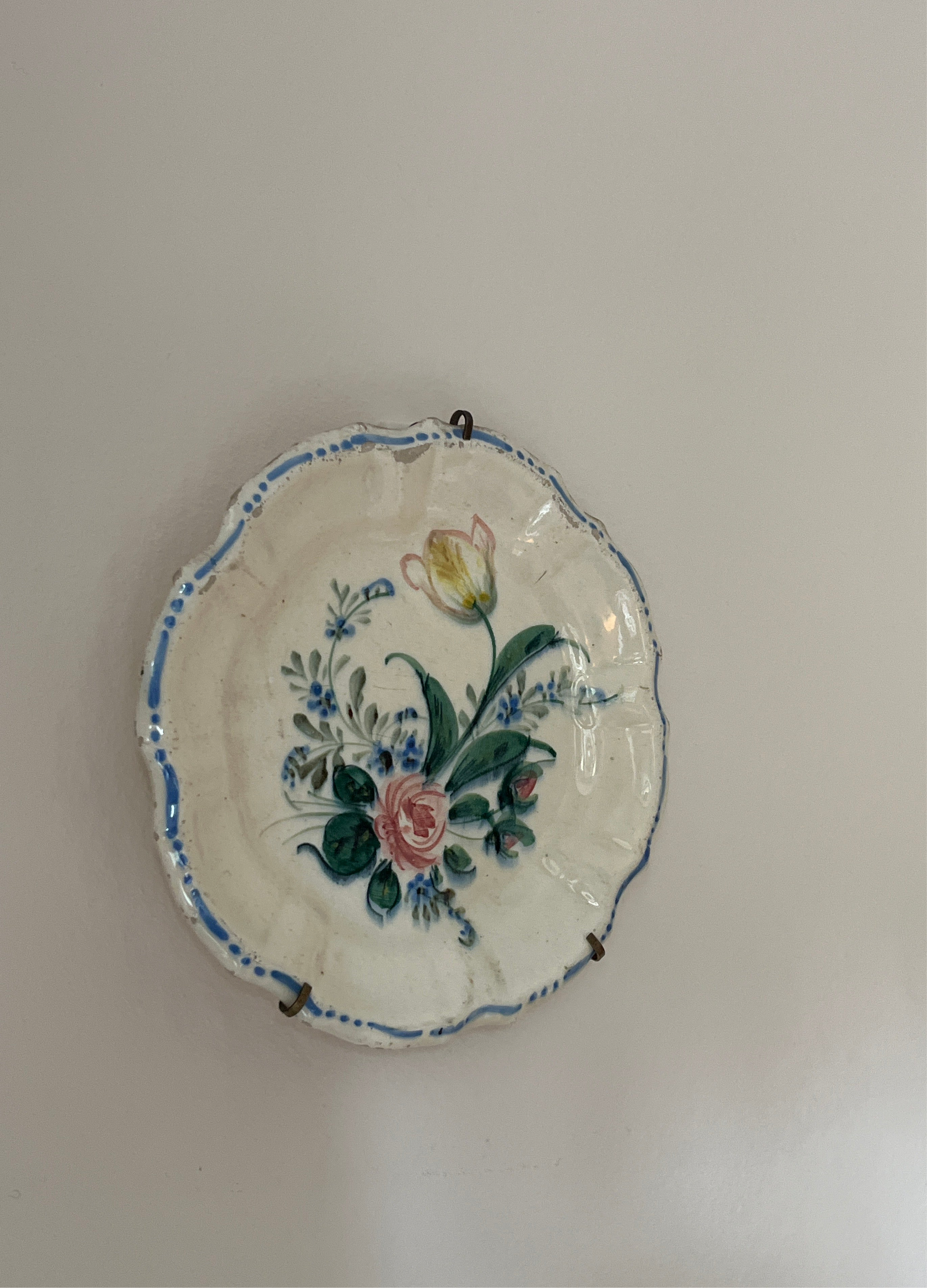 Fin lille vægtallerken med blomster motiv og patina. Medfølgende monteret vægophæng. Signeret på bagsiden.