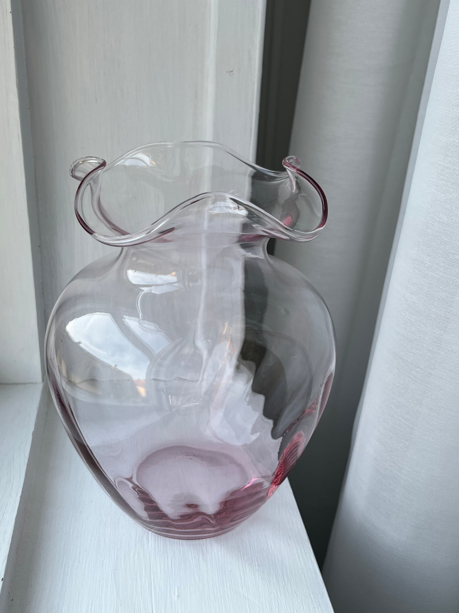 Mundblæst glasvase fra 1960’erne i sart rosa med blid swirl effekt og bølget kanter.